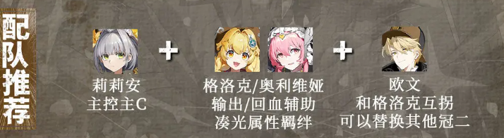 在队伍搭配方面,莉莉安可担任主C兼控制核心的角色。第二个位置推荐使用格洛克或奥利维亚:前者能补充额外输出,后者提供治疗与辅助支持。两者均可与莉莉安共同激活光属性羁绊,带来团队增益。面对高输出对手时优先选用格洛克确保压制力;若敌方控制或异常状态频繁,则奥利维亚更能保障团队生存。