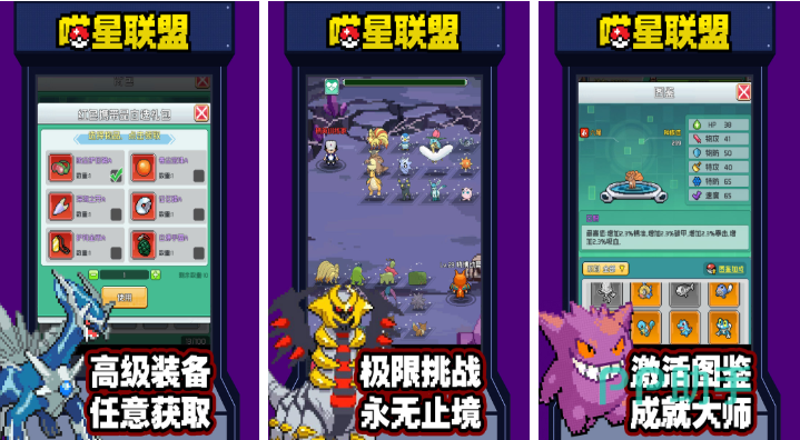 喵星联盟这款像素背景宝可梦作品在手游端名气很大,特殊的养成和抓捕宝可梦的风格十分有趣,多样主题的地图增加了探索性,真实真人对抗的跨服竞技、天梯竞赛玩法竞技性拉满,宝可梦的战斗系统也是灵活多变,地形和宝可梦的属性也会影响基础的战斗,高阶级的装备亦可免费解锁为宝可梦进行装备。