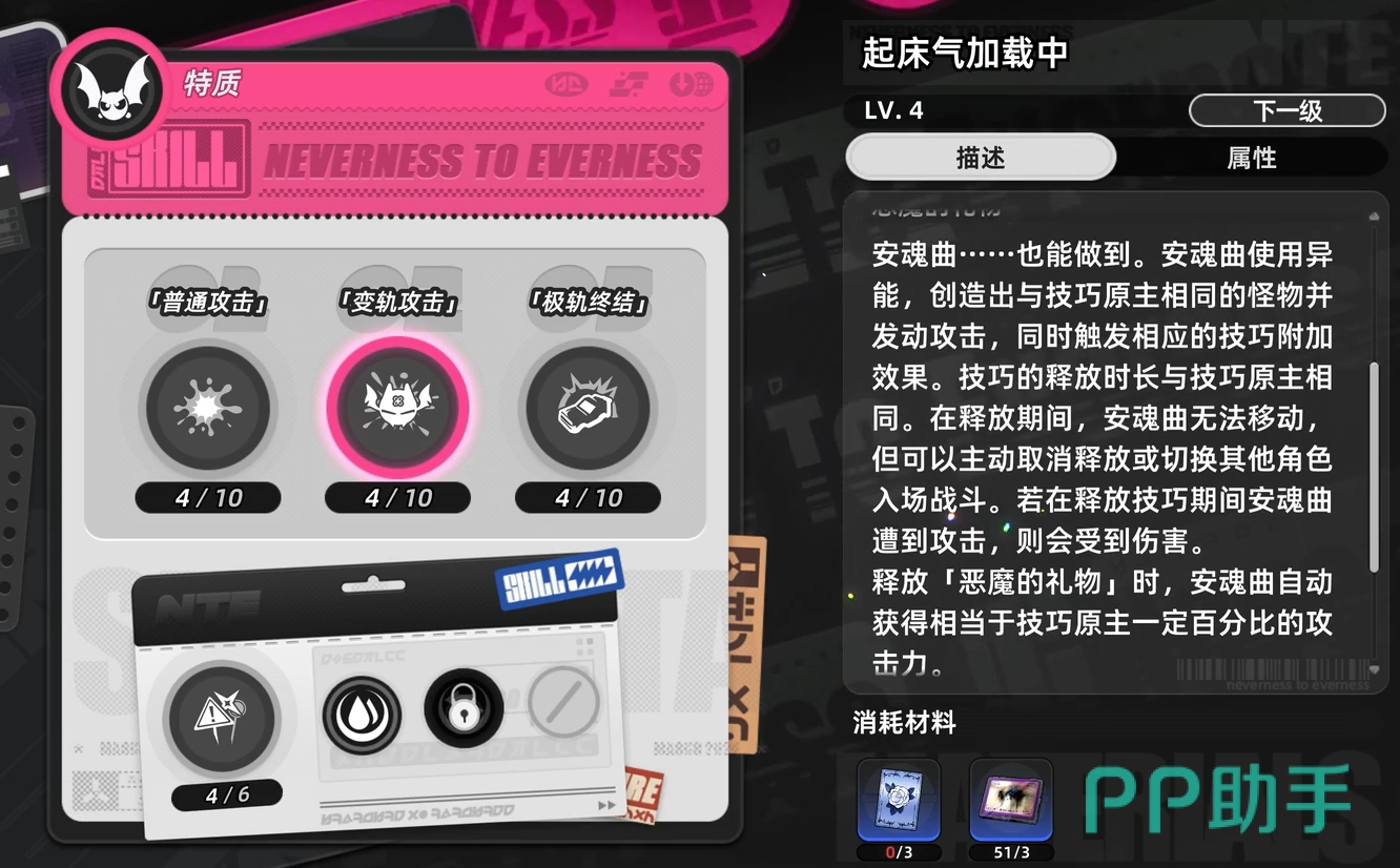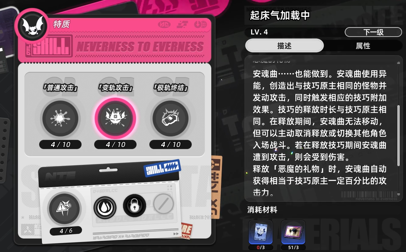 她的基础攻击分为短按与长按两种模式。短按普攻共含多段连击,每一段命中敌方均可施加1层“噩梦”效果,该效果最多叠加至10层。随着层数提升,敌人将持续承受递增的额外伤害,形成显著的伤害增幅曲线。而长按普攻则触发“摹写”机制:安魂曲将锁定目标并模拟其战斗行为,在后续短按普攻中复现该敌人的特定攻击动作。若已存在摹写目标,再次长按将覆盖原有摹写对象;需注意的是,处于长按摹写状态期间,无法通过普攻叠加噩梦效果,须主动松开按键或切换动作方可恢复。