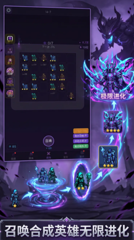 开局即置身于幽邃暗域场景,玩家将直面持续涌来的敌方单位。操作强调即时反应与走位预判,不同英雄拥有差异化定位——如高爆发法师、持续续航辅助、强控型战士等。建议新手优先体验多个初始英雄,通过实战积累对技能释放时机、冷却衔接及范围判定的理解。随着主线推进,怪物强度阶梯式提升,此时可通过“英雄合成”机制快速强化主力角色:将两名相同英雄拖拽叠加,即可完成升阶,显著提升基础数值与技能等级。