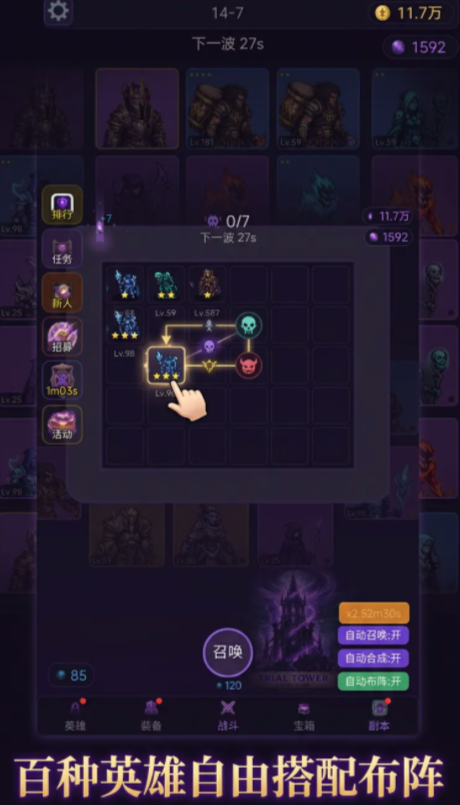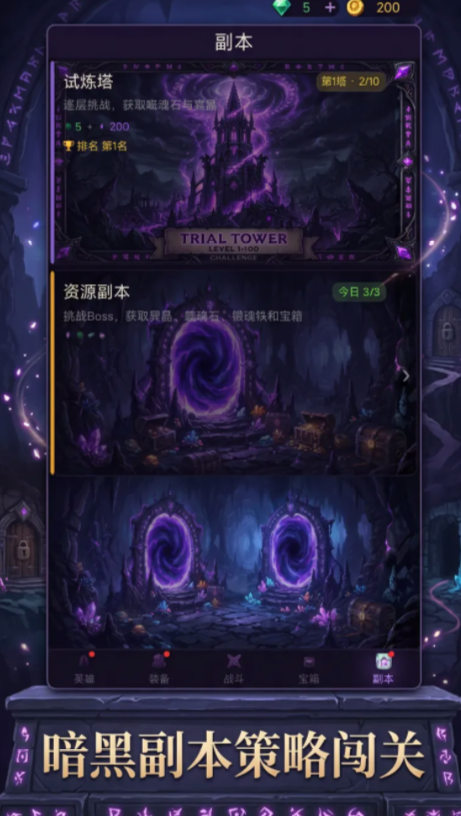 除主线挑战外,游戏内置多维度副本体系,包括限时突袭、生存试炼、Boss攻坚等类型,各副本设有独立机制,例如地形限制、增益/减益状态叠加、阶段转换规则等。防守压力较大时,需重点优化前排承伤能力与后排输出节奏;进攻向副本则更依赖技能连招与打断控制。每轮通关后均可获得宝箱奖励,内含装备材料、升星道具及英雄碎片,助力角色持续进阶。面对高难度敌人,务必观察其攻击前摇与行动模式,针对性释放控制或闪避技能,以达成关键反杀。