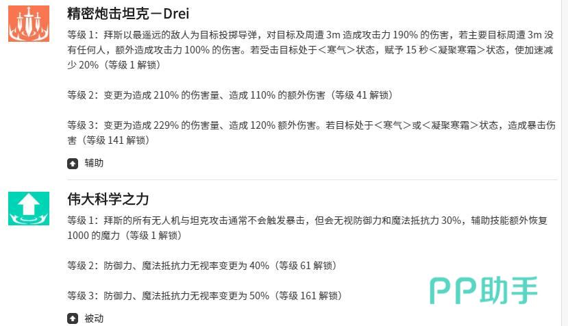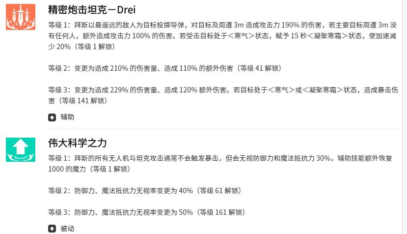【精密炮击坦克】为中距离范围打击技:向指定位置投掷高爆导弹,在半径3米内触发高额溅射伤害;当技能升至2级时,额外提升100%基础伤害,显著增强区域压制力。区别于纯输出路线,【伟大科学之力】赋予拜斯团队增益维度——激活后,自身防御力与魔法抗性同步提升,兼顾生存与持续作战能力,体现其作为指挥官的战术全局观。