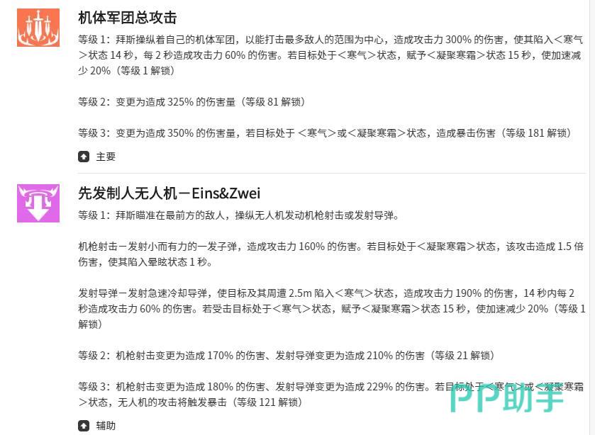拜斯的核心战斗风格围绕“远程压制+群体控场”展开。首项主动技能为【机体军团总攻击】:召唤多台协同作战的自律机甲,对目标区域发动齐射,单次命中可造成300%攻击力的物理伤害,并附加寒气状态效果——使敌方单位移动速度降低20%,持续数秒。该技能随等级提升可强化基础倍率,是前期清场与节奏控制的关键手段。第二技能【先发制人无人机】则侧重精准干扰:释放高速巡航无人机,锁定目标后发射制导导弹,除基础伤害外,同样附带寒气效果,进一步压缩敌方机动空间,形成双重减速叠加。