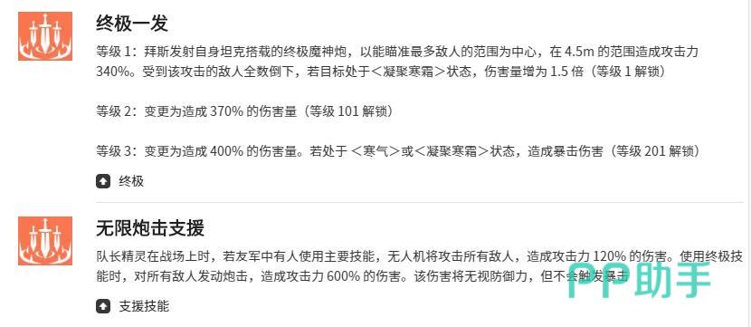 大招【终极一发】是拜斯的标志性终结技:驱动搭载式主炮,向敌方核心目标发射高能穿甲弹,爆炸范围覆盖周围4.5米区域,实现广域爆发输出。另一关键辅助技【无限炮击支援】则凸显其体系价值——当队伍中任意成员释放主力技能时,该技能自动触发,对全体敌人追加无视防御的真实伤害,大幅提升组合技连携效率与破防稳定性。