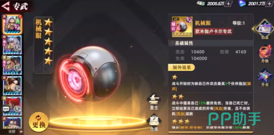 若想进一步强化卢卡尔的实战表现,推荐为其配备专属武器“机械眼”。该装备专精于提升破坏状态下的伤害输出,每次星级升级都会带来属性成长,最高可达五星满级。机械眼对处于流血状态的目标具有额外伤害加成,与卢卡尔的核心机制高度契合,能够显著放大其群体压制能力。在阵容搭配方面,首推组合为大蛇、高尼兹、千鹤与特瑞。此阵容配置豪华,输出密度高,其中卢卡尔与大蛇共同承担主要AOE职责,在团战中火力覆盖广泛。