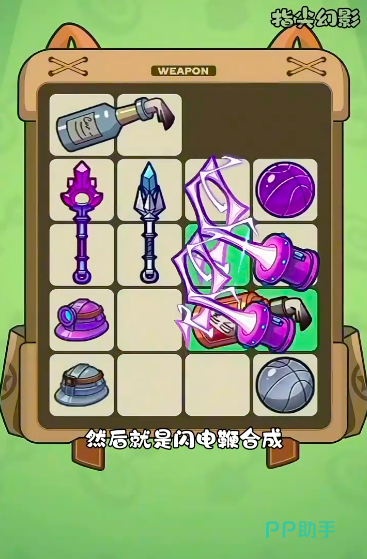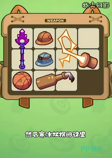 再摆上一个一级头盔,将闪电边摆放在最右边的三个格子中,之后将3级寒冰杖放置在最左侧的两个格子中,将燃烧瓶合成2级,将最后出现的1级头盔与格子中的1级头盔和2级头盔合成3级,就可以开始战斗了。