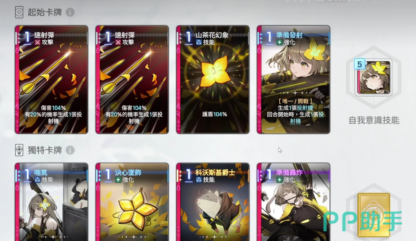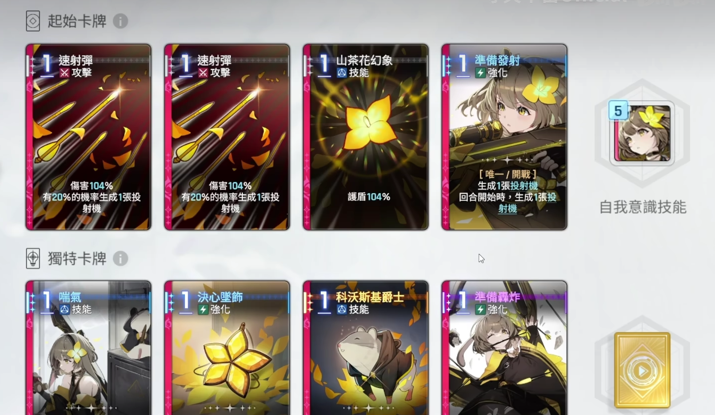 在深入了解灵光一闪前,需先理解角色卡牌的基本构成。每位角色拥有起始卡牌与独特卡牌两类资源。在角色面板中可见四张起始卡牌和四张独特卡牌,但实际上,仅前三张被定义为起始卡牌,其余五张均属于独特卡牌范畴。这些卡牌均可参与灵光一闪的触发机制,是后续强化体系的基础。