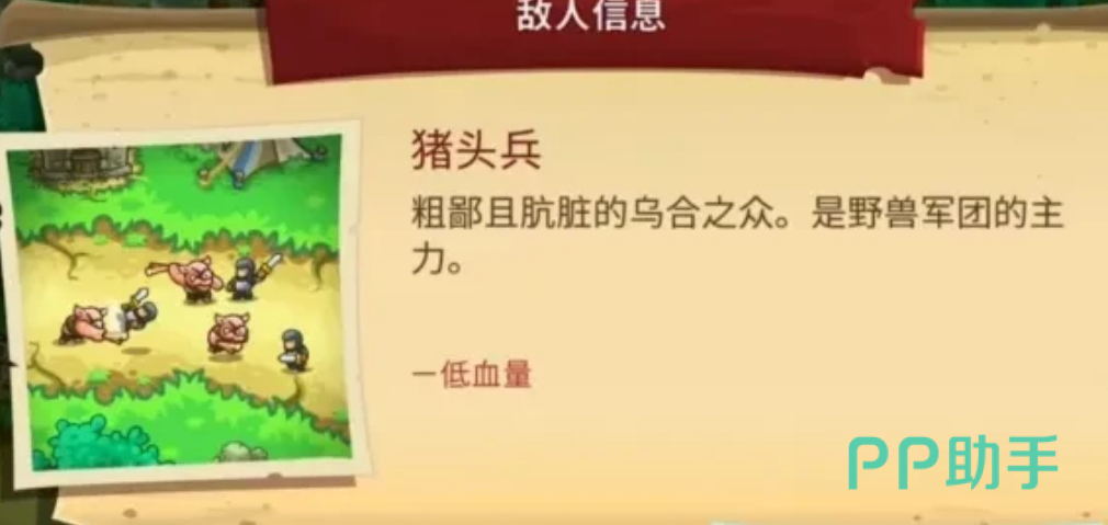 1、猪头兵:基础敌人之一,生命值偏低,构成野兽军团的核心步兵单位。虽然个体较弱,但常以数量压制防线,属于典型的低威胁高密度目标。