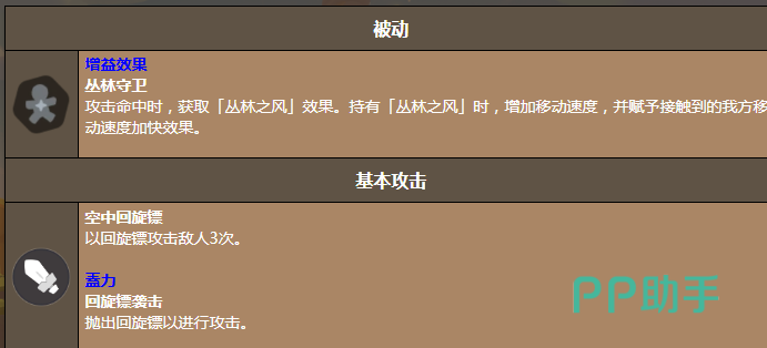 普通攻击采用三段式空中回旋镖连击,命中率稳定且节奏紧凑;被动技能“丛林守卫”是其团队价值的关键——每次攻击命中后触发“丛林之风”,不仅提升自身移速,还能将增益效果同步覆盖至周围友方单位,显著强化队伍整体转场与先手压制能力。冲锋技能具备瞬发突进特性,支持快速切入、侧翼支援或残血收割,操作响应灵敏,容错率高。