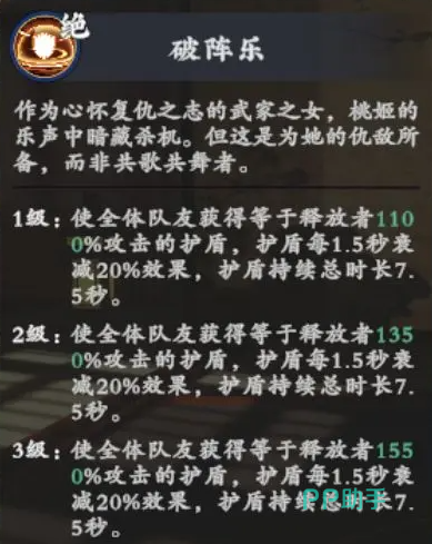 隐龙的神龙功可对范围内全体敌人发动10次连续打击,每次造成93%攻击力的伤害,并附加持续6秒的强制嘲讽效果。值得注意的是,该嘲讽存在动态衰减机制:我方每命中目标一次,其剩余持续时间即减少10%,削减依据为目标当前移动速度值计算。搭配桃姬后,队伍生存韧性显著提升——其主动技“破阵乐”可为全体友方生成等同于自身1100%攻击力的护盾,该护盾按每1.5秒衰减20%的比例递减,总持续时长稳定维持在7.5秒。