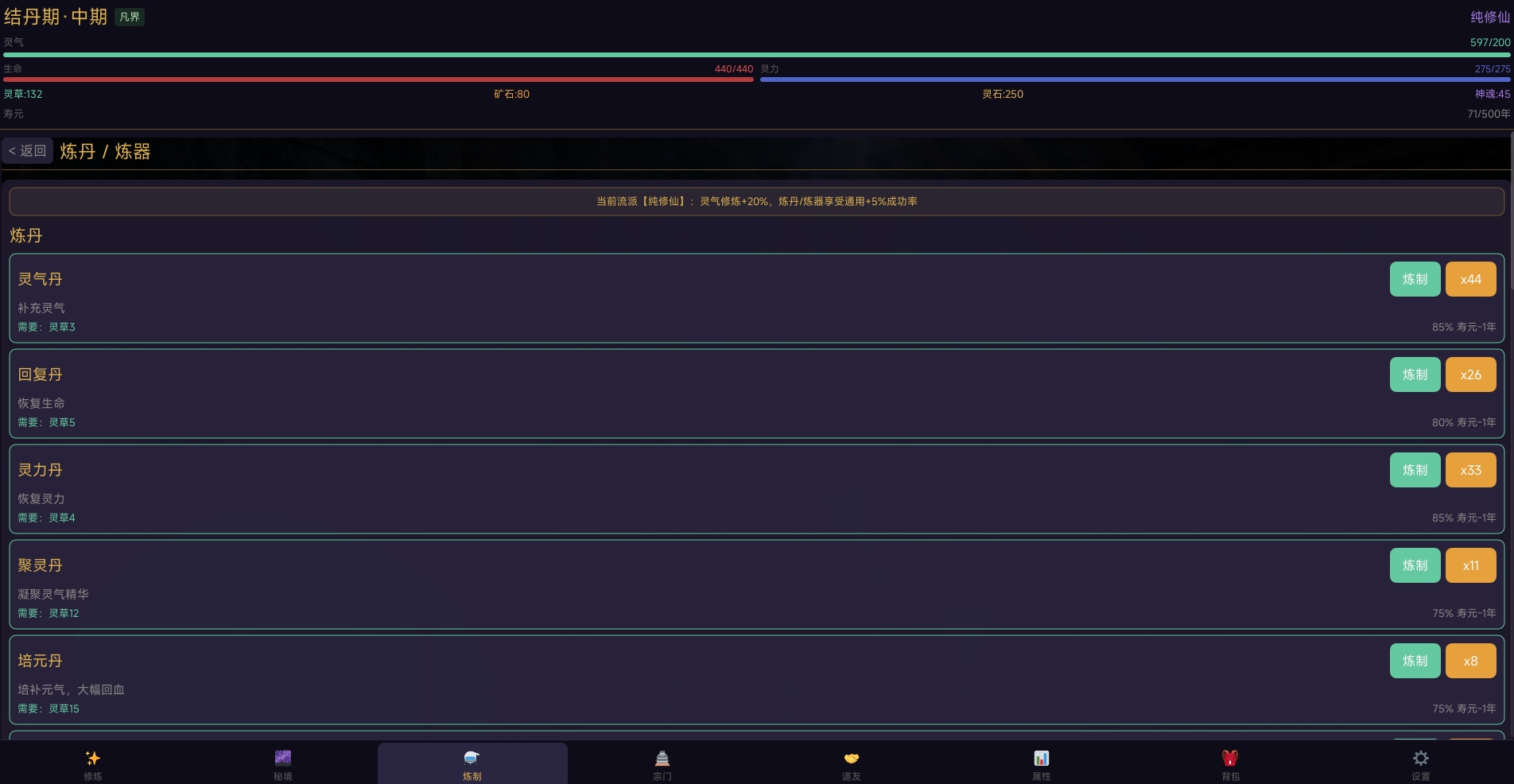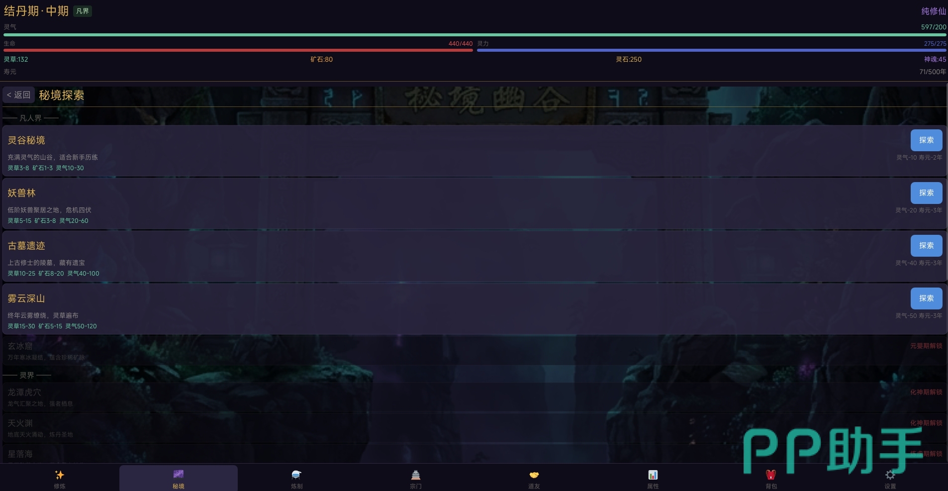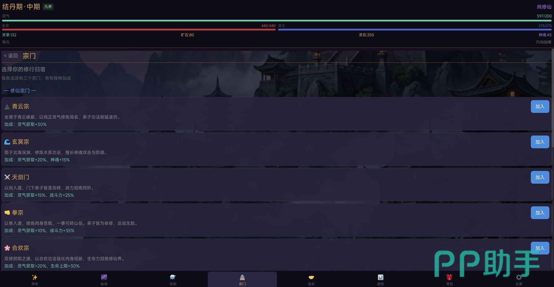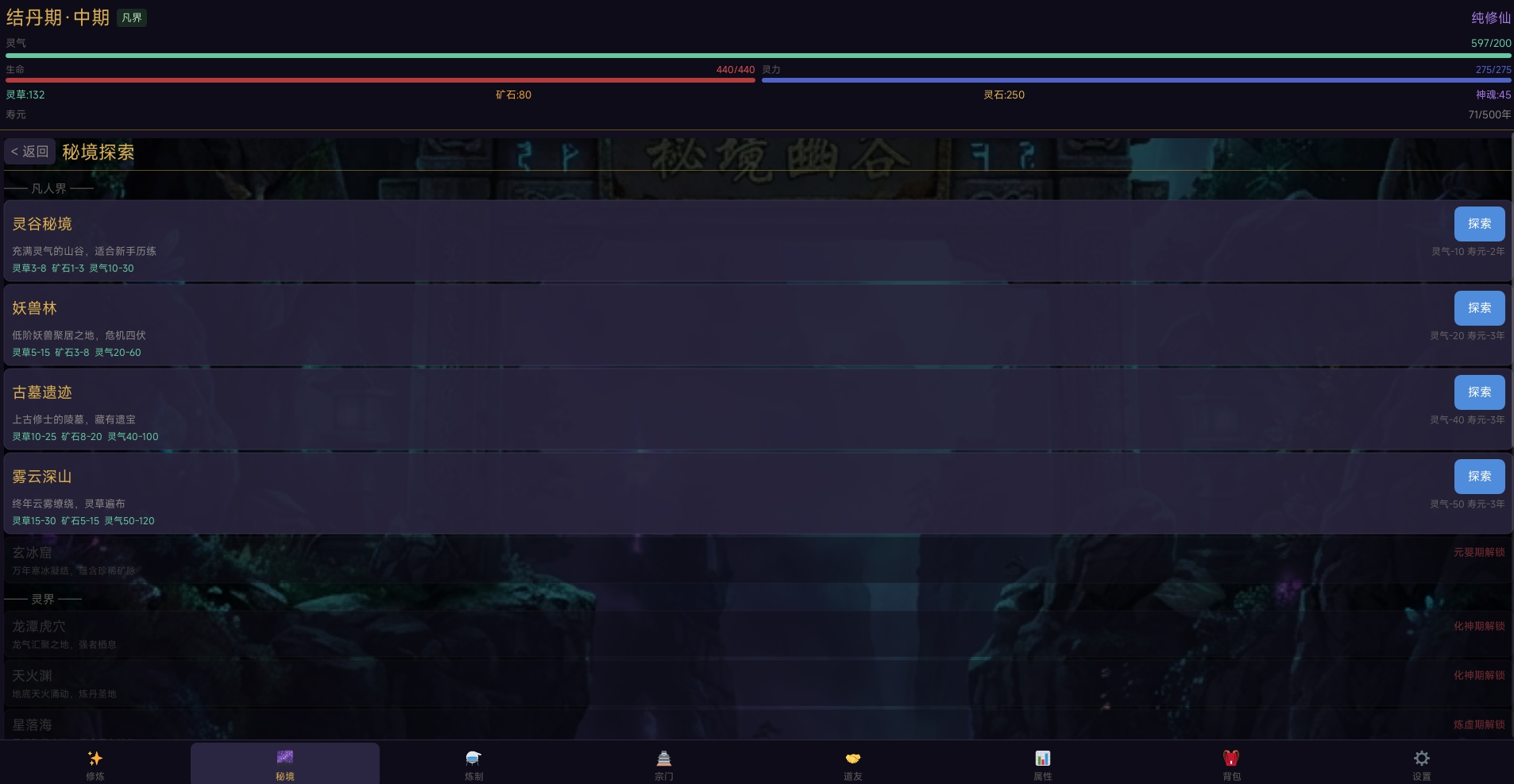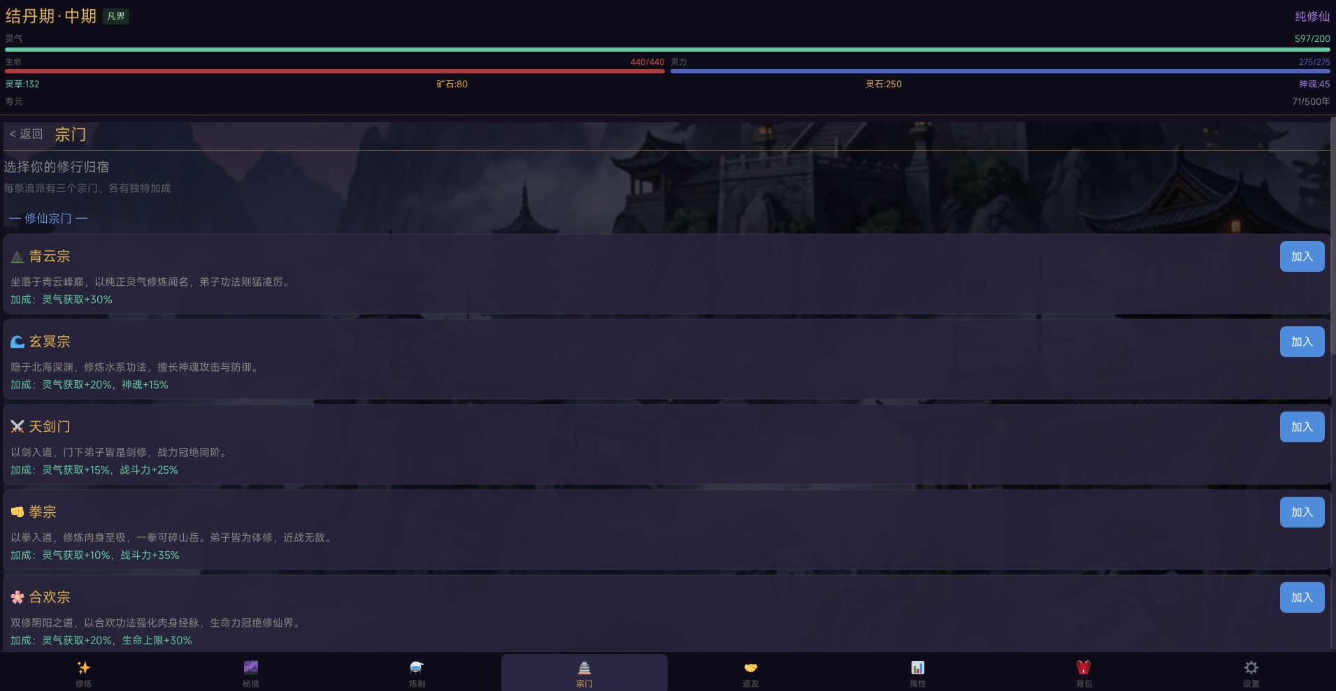游戏深度还原经典修仙生态:玩家可于专属洞府静心吐纳、凝练真元;亦可深入上古秘境探幽寻宝,采集百年灵芝、万载玄铁等稀缺资源,用于炼丹、炼器双线成长。所成丹药与法宝既可自用提升战力,亦可交易换取灵石,持续反哺修行进度。社交体系同样丰富——结交志同道合的道友切磋印证,组队闯关共破禁制;若倾向体系化成长,还可择一上宗拜入山门,承接宗门试炼、积累贡献值、晋升弟子阶位,并解锁专属神通与传承秘术。随境界跃升,地图开放、玩法模块与剧情分支将同步延展,构建高沉浸式修真长线体验。