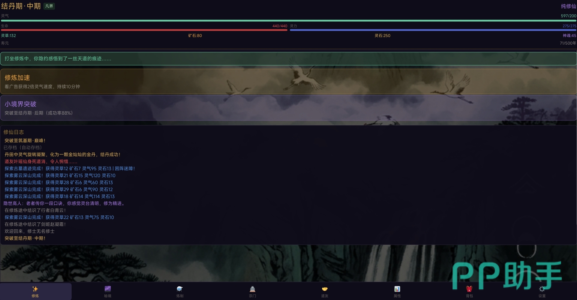 奇遇系统是本作核心亮点之一。无论是在坊市闲逛、山野跋涉,抑或秘境深处穿行,均有概率触发随机事件。部分奇遇赠予逆天机缘——如拾得失落仙器残片、偶遇隐世大能点化、甚至窥见上古飞升遗迹;另一些则暗藏凶险,需谨慎抉择方能化险为夷。关键选项往往仅有一瞬,选对则顿悟大道、直抵金丹;选错则灵脉受损、陷入濒死危机。命运走向,全系玩家一念之间。