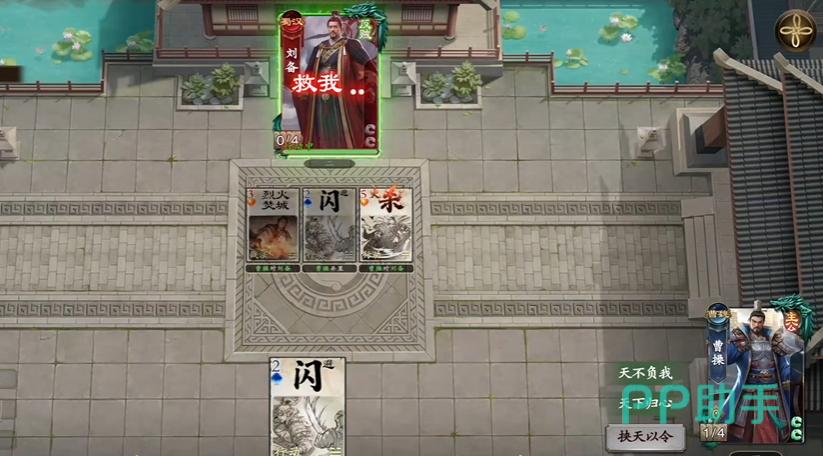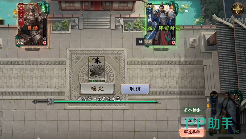 先对曹操出杀,曹发动技能乱世之后得到杀。后对曹使用二技能,要注意一下技能发动的时间,要优先选择曹操,然后再选择吕布。之后对曹操用三技能,注意技能发动时依然先选择曹,再选择吕布就可以获胜了。