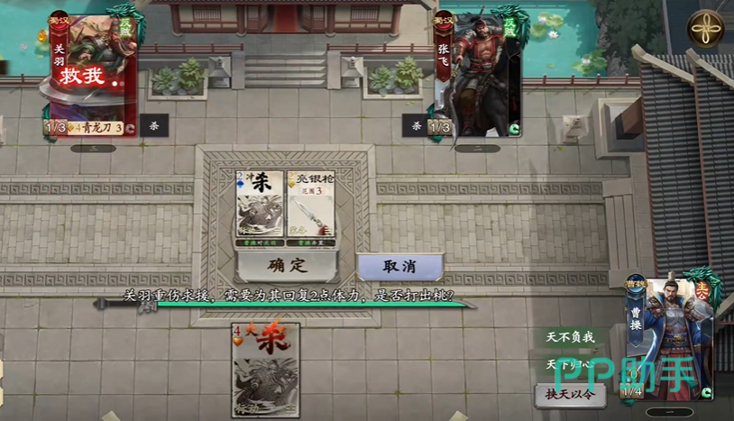 需要装备方天画戟,对关羽出杀牌,弃牌可以触发装备的特效,能额外选定张飞为目标,之后获胜。
