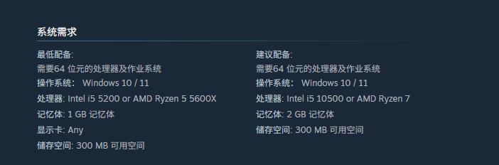 尽管硬件要求宽松,仍可参考如下官方推荐配置:操作系统需Windows 10及以上版本,建议使用Windows 11以获得更优兼容性;处理器最低为Intel Core i5-5200U或同性能级别AMD APU;内存最低1GB,推荐2GB以保障后台多任务流畅;显卡无强制型号限制,集成显卡即可胜任;安装所需磁盘空间仅为300MB。该规格远低于主流游戏标准,绝大多数近十年内生产的笔记本与台式机均可稳定运行。