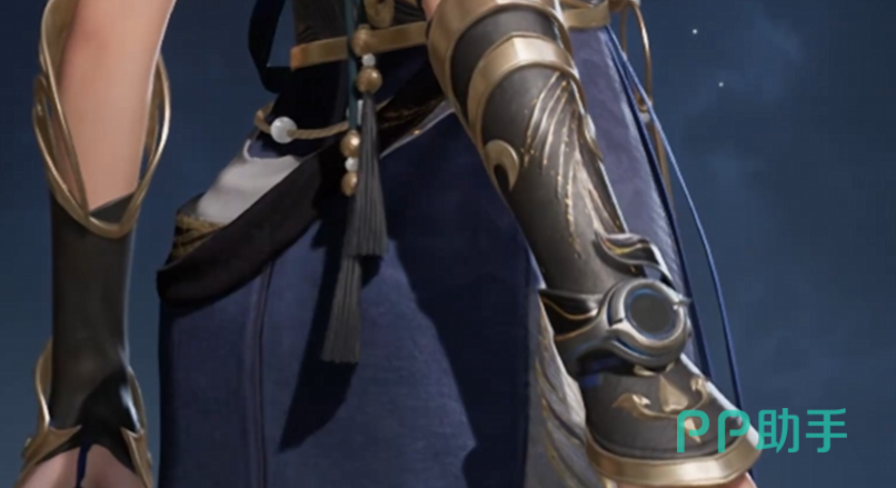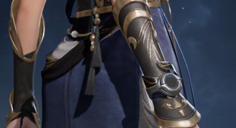 服饰主体为不对称结构的黑金渐变长裙,纹理层次丰富,光影过渡自然。袖部与腕饰一体化设计尤为精妙:手环与袖套形成视觉连贯体,避免了常见时装中配饰孤立外露的割裂感,大幅增强整体协调性。此特性使其在混搭场景中表现优异,尤其适合追求个性化外观组合的玩家。
