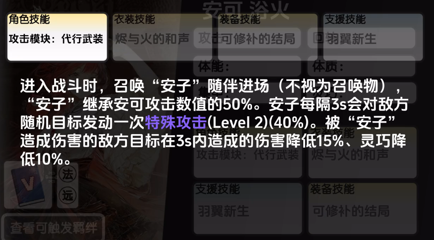 她的主动技能名为代行武装,战斗开始时会召唤出名为“安子”的伙伴入场。需要注意的是,安子不被判定为传统意义上的召唤单位,实际形象为一只小红鸡,属于安可本体的延伸。安子继承安可50%的攻击力,每隔3秒对随机敌人发动一次特殊攻击,造成40%的伤害。被安子击中的目标将在3秒内受到减益:所造成伤害降低15%,灵巧属性下降10%。