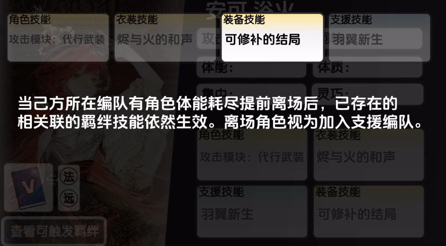 装备技能“可修补的结局”具有较强的战术价值:当己方编队中有角色因体能耗尽提前退场时,与其相关的羁绊效果仍可持续生效,并视该角色已加入支援编队。这一机制极大增强了团队的持续作战能力,尤其适配安可依赖多角色联动的体系。后期可根据战场需求灵活更换其他装备,但此技能目前仍是首选。