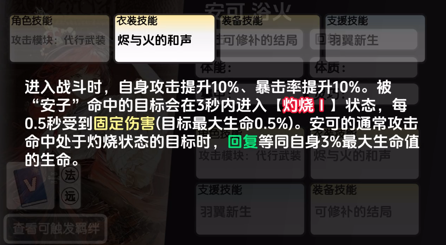 衣装技能“烬与火的和声”在进入战斗时生效,使安可自身获得10%攻击力提升与10%暴击率加成。每当安子命中敌方目标,该目标将在3秒内进入【灼烧1】状态,每0.5秒承受相当于其最大生命值0.5%的固定伤害。此外,当安可的普通攻击命中处于灼烧状态的目标时,可回复自身最大生命值3%的生命量。