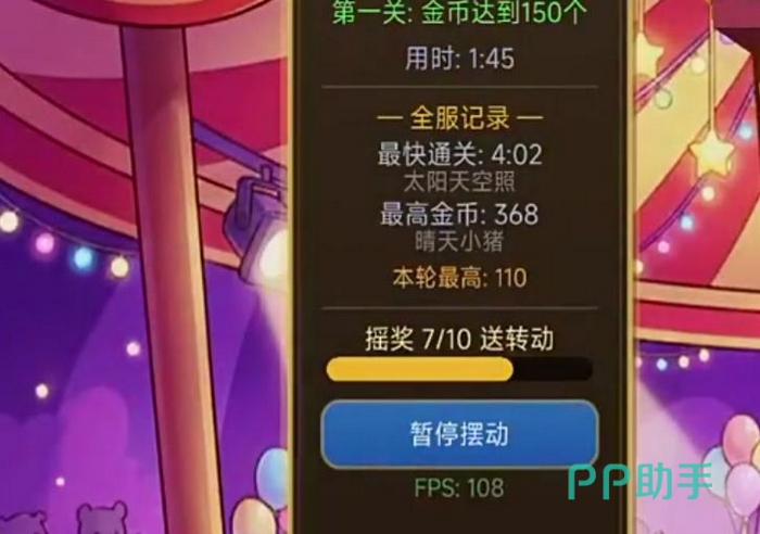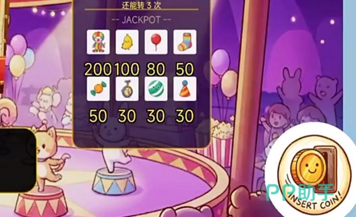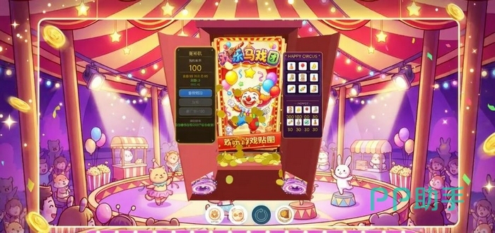 整体美术风格以马戏团为主题,配色明快活泼,场景融合旋转木马、彩灯拱门、气球飘带等游乐场标志性元素。推币机台造型考究,灯光随操作实时变化,奖励触发时配有粒子特效与立体音效,强化“中奖瞬间”的临场震撼感。