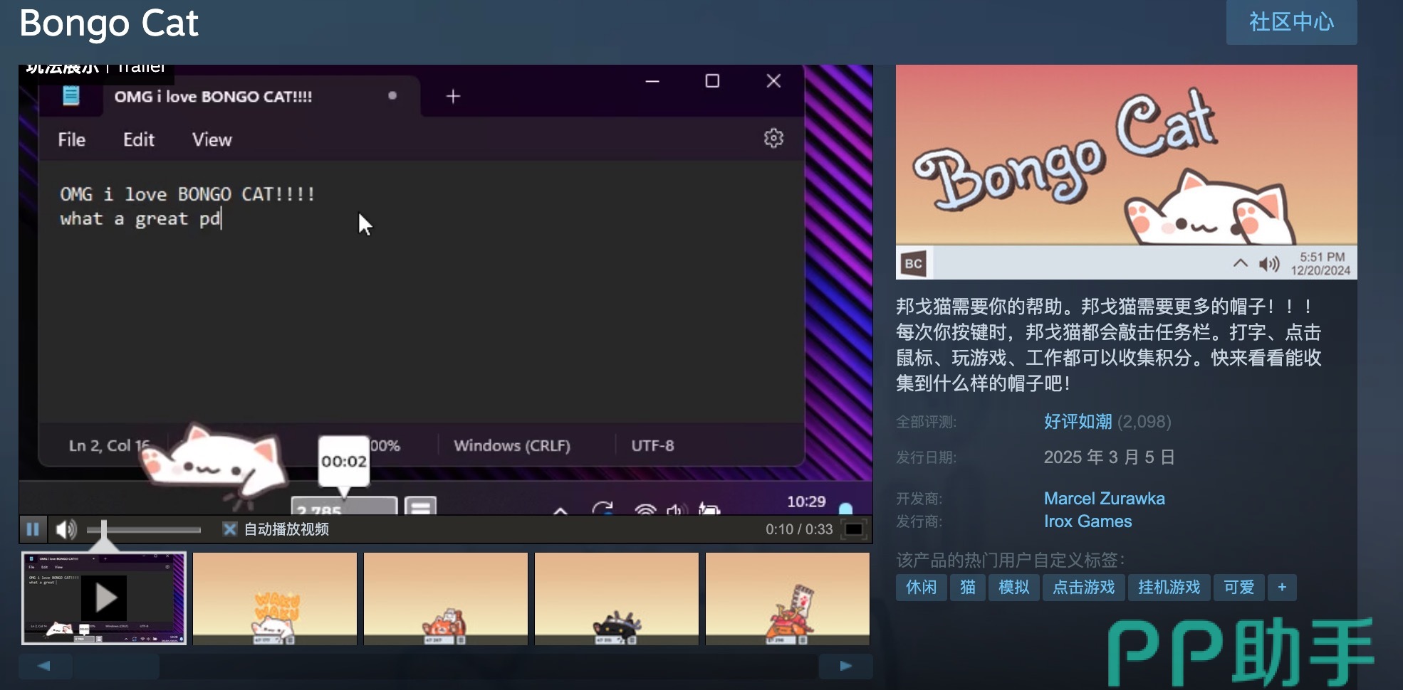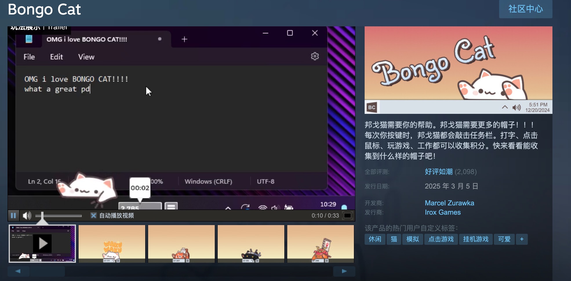 操作起来非常简单!首先,你可以通过Steam平台下载这款游戏。只需打开你的浏览器,输入Steam官网地址:https://store.steampowered.com/app/3419430/Bongo_Cat/,就能找到BongoCat的下载页面。点击“购买”按钮(虽然游戏是免费的,但购买流程仍需进行),然后按照页面提示选择文件存放位置,点击“马上开玩”,就能开始下载了。