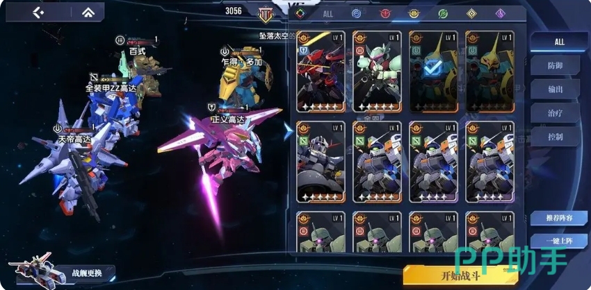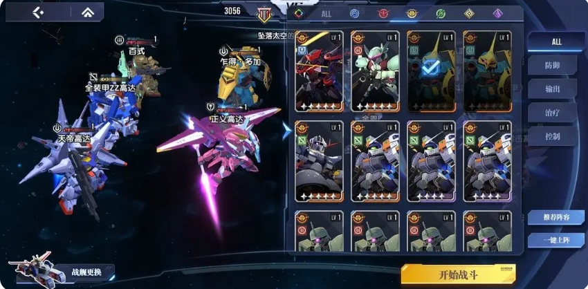 正义高达和天帝高达不断地给敌人持续叠加燃烧debuff,在它们的攻击下,有多层燃烧debuff让,而当这些被燃烧debuff笼罩的敌人攻击乍得多加时,乍得多加的攻击不断提升,燃烧debuff机体攻击百式时,百式则如同一位拥有神奇治愈能力的医师,能够恢复耐久,让自己始终保持最佳的战斗状态,全装甲ZZ高达则能够让全队的生存能力提高。