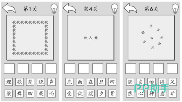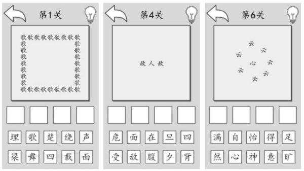 这款游戏奇妙之处便在于字猜字这一有趣设定机制,例如由数个歌字围成的一个正方形,略加思索便可以猜出它想要表达的成语就是四面楚歌。在《看字猜成语》里就为大家提供了各种脑洞大开的文字谜题,供大家展开思索猜测背后的成语是什么。游戏简单清爽的页面,也令大家的娱乐玩耍无比舒爽。老人小孩玩家可以尽情挑战,通过益智娱乐转动脑袋思索。