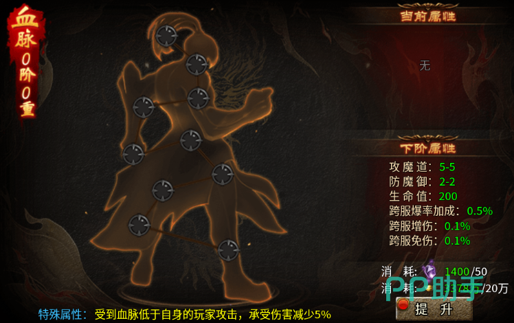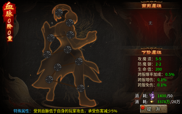 血脉系统是跨服PVP阶段的核心竞争力来源。提升血脉需消耗紫灵石与元宝,每阶包含多重“重级”,每提升一重,即可获得跨服爆率、跨服增伤、跨服免伤三项关键加成。当双方参与跨服战斗时,若己方血脉阶数高于对手,将额外减免5%所受伤害。该机制使血脉成为中后期战略配置重点,直接影响战场容错率与压制能力。