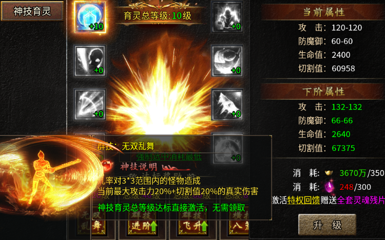 付费玩家可通过礼包快速补充神技残页,同时解锁VIP专属特权。但本作设计逻辑强调长期挂机收益,非氪金用户完全可通过时间积累达成同等进度。此外,“神技育灵”系统提供另一条属性强化路径:消耗元宝激活神技之灵后,可提升攻击、防魔御、生命、切割四大基础属性。界面中清晰展示当前育灵总等级及各等级对应的额外属性加成,便于玩家规划资源分配。