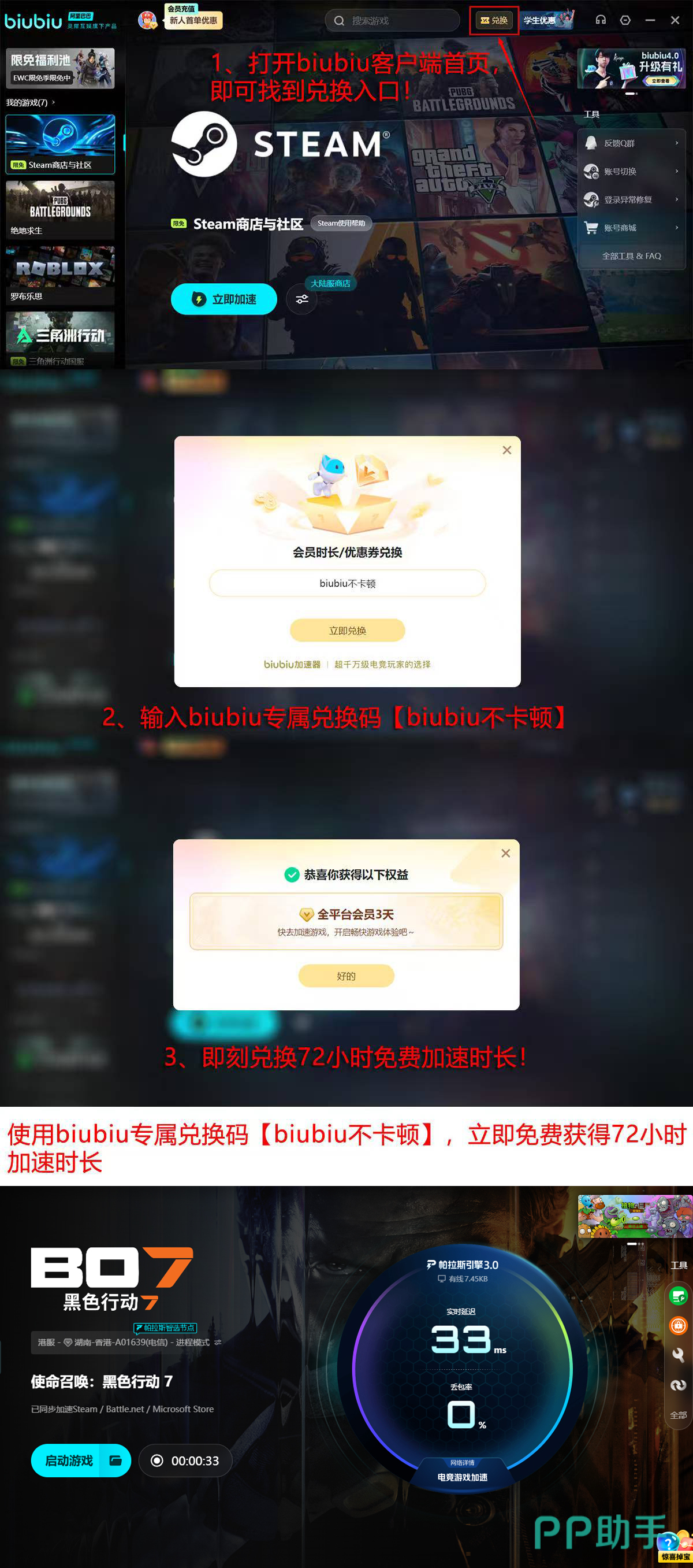 为进一步优化用户体验,biubiu邀请职业选手左梓轩担任产品体验官,结合专业电竞操作反馈,持续改进客户端性能表现。现所有用户均可通过输入口令【biubiu不卡顿】在应用首页兑换3天免费使用时长,新注册用户还可额外领取24小时福利,合计享受96小时加速服务。