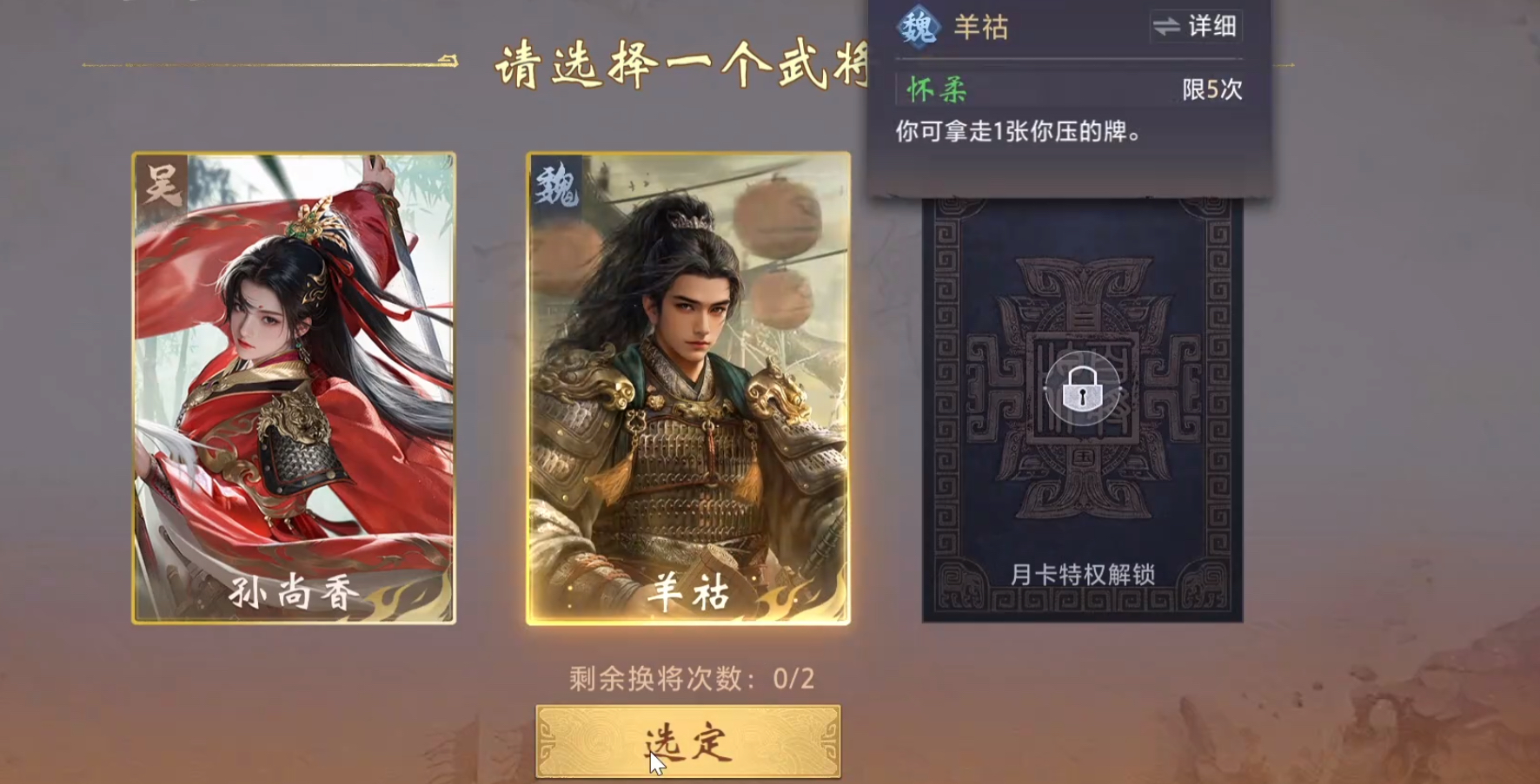 羊祜为另一名T1级功能性武将,获取方式同样为商城直购,价格为688金饼。其技能效果为“压制掠夺”:每当成功压制对手出牌时,可从被压方牌堆中自主选取1张牌加入手牌,整局最多触发5次。该机制支持高度自由的战术决策——玩家可根据当前手牌结构,定向获取顺子组件、炸弹拼图或关键功能牌,极大增强牌型构建灵活性。