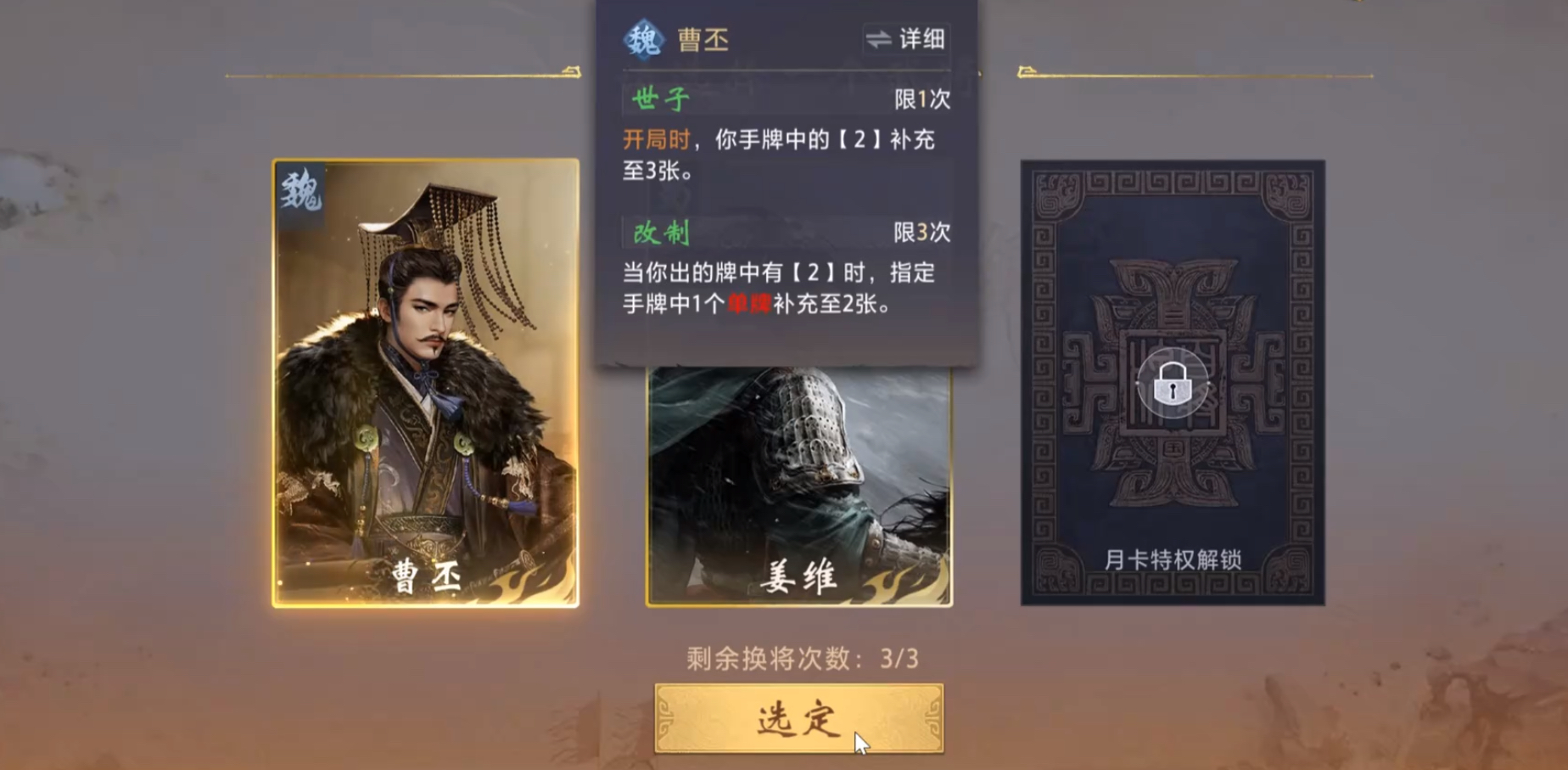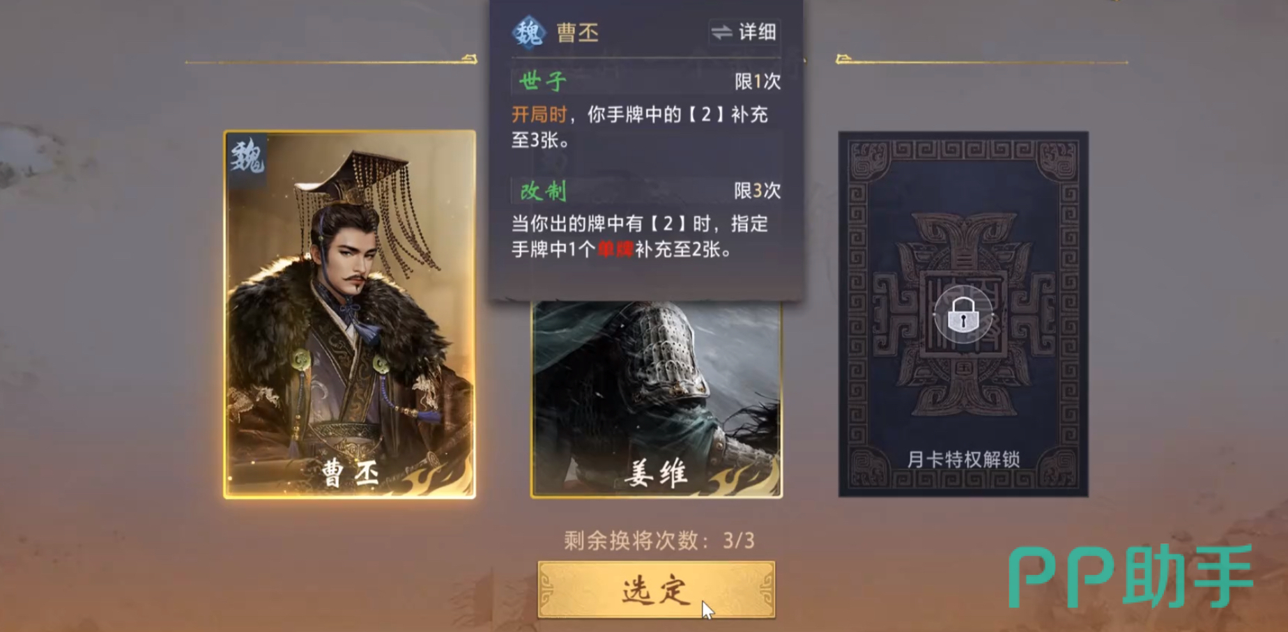 曹丕定位为T1级控场型武将,通过连续完成7日登录签到任务免费获取。其技能设定围绕数字“2”展开:开局即额外获得3张点数为2的牌;每次打出任意一张2时,可将手中任意一张单牌即时转化为同点数对子。该机制使其在常规对局中具备极强的节奏掌控力与场面压制力,尤其适配多轮次拉锯战与资源消耗型打法。
