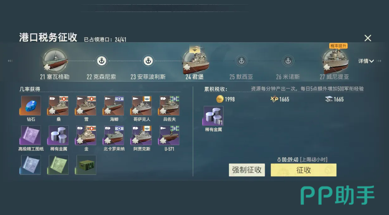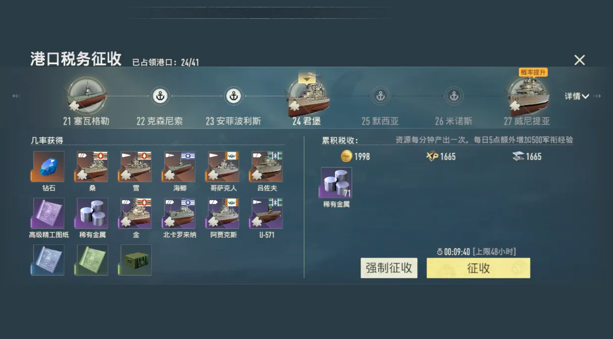 【港口税收】承担着长期资源供给职能,是玩家进入中后期后可持续运营的核心机制。所有已占领港口均具备自动产出能力,在挂机状态下持续结算金币、经验值、稀有金属及图纸等多元资源。其产出模型遵循线性叠加原则:控制港口数量越多,单位时间内的综合收益增幅越显著。该系统弱化手动操作依赖,强化宏观布局价值,使领土规模直接转化为实质发展动能。
