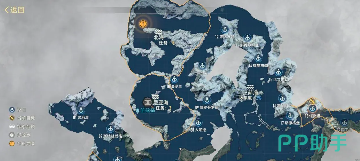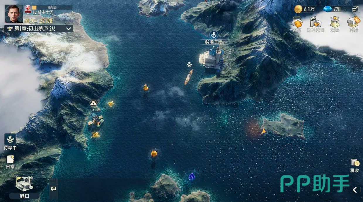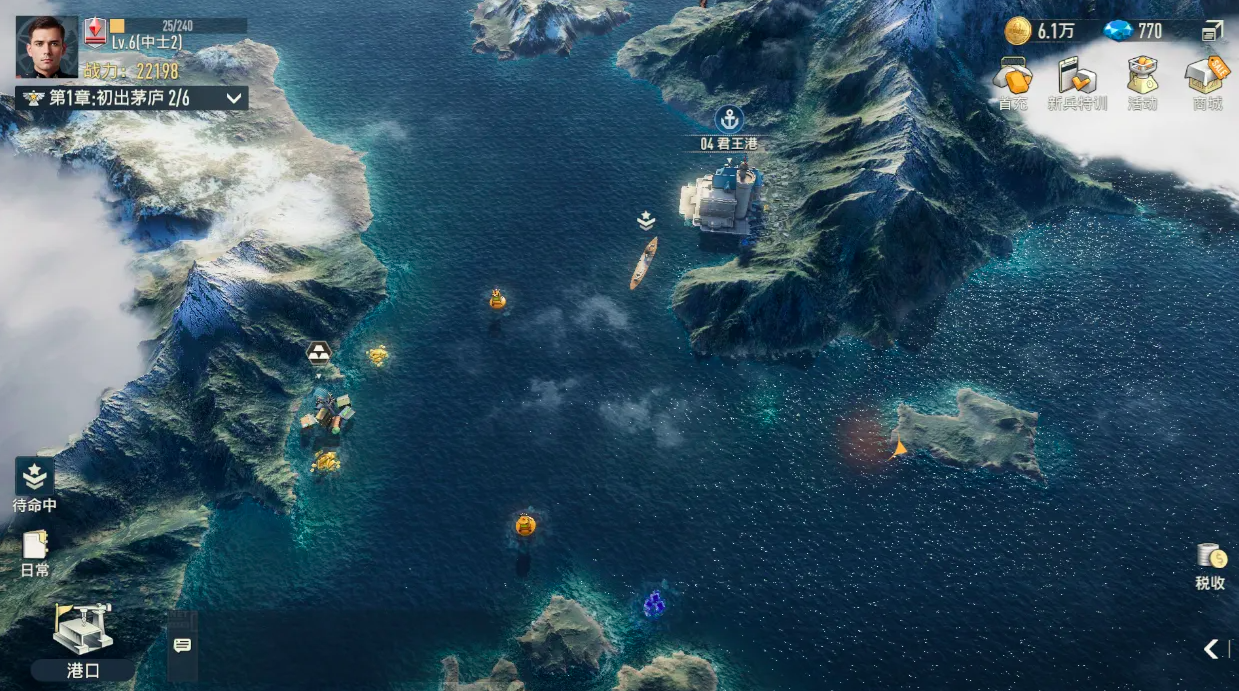 【战略地图】提供全局视角下的战场可视化管理。采用俯视2D地图结构,清晰标注已占领港口、待攻克目标及当前攻坚中的节点位置,支持一键跳转至任意区域,大幅减少界面切换与路径查找耗时。该模块不仅是作战指令下达中枢,更是资源调配、兵力部署与阶段目标规划的决策支持平台,有效支撑多线程战略协同。