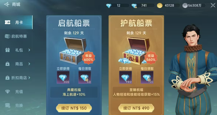首先,当你创建角色进入游戏后,你会发现这游戏的氪金元素挺多的。不是所有的氪金都让你觉得“被逼”。其实,游戏内有几个值得投资的项目,比如大小月卡。你可以选择性地充值购买,每天都会有钻石收入,还有航速和经验的加成。尤其是如果你决定走一条稳定的进步路线,月卡对于你来说,真是非常值得的。