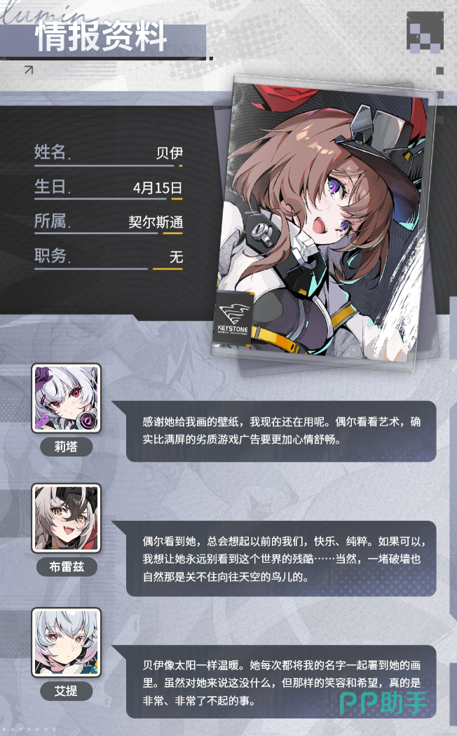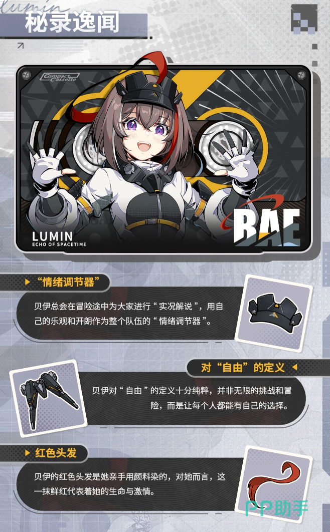 贝伊既是契尔斯通先锋勘测小队的实战尖兵,也是绿梦时空之声世界观中文明韧性的视觉化身。她用行动诠释:即便侵蚀尚未退散,人类仍可通过技术理性与精神自觉,在废墟之上重新校准希望坐标。绘画是她的观测方式,战斗是她的语言形式——二者共同将外部世界的复杂性引入要塞认知体系,也为所有玩家提供了一条通往未来重建的认知通道。