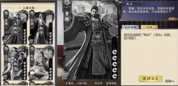 这种选择性的打法,即便是面对那些被当作某张特定牌打出的牌,曹操也能凭借这样的技能,将其还原至初始状态并打出,比如当美羽通过武圣技能将桃当作杀打出,并不幸被曹操获得时,曹操却能巧妙地将这张牌当作桃使用,为自己或队友争取到宝贵的生机,除了应对来自武将的伤害外,曹操的乱世奸雄技能还能应对那些来自非卡牌的伤害,如天雷地火等卡牌,在这些情况下,曹操同样能够获得对应的牌,并进行立即打出,然而需要注意的是,如果曹操受到的伤害并非来自于卡牌,而是来自于其他非卡牌的伤害源,那么他将无法获得任何牌。