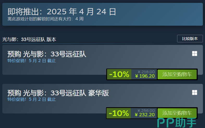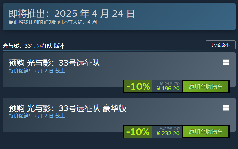 《光与影33号远征队》已经定于2025年4月24日正式发售,目前已开启预购,Steam国区标准版预购价196.2元,豪华版232.2元送原声+美术集,登陆Xbox Series X|S、PS5和PC(steam和Epic)平台,并首发加入XGP。