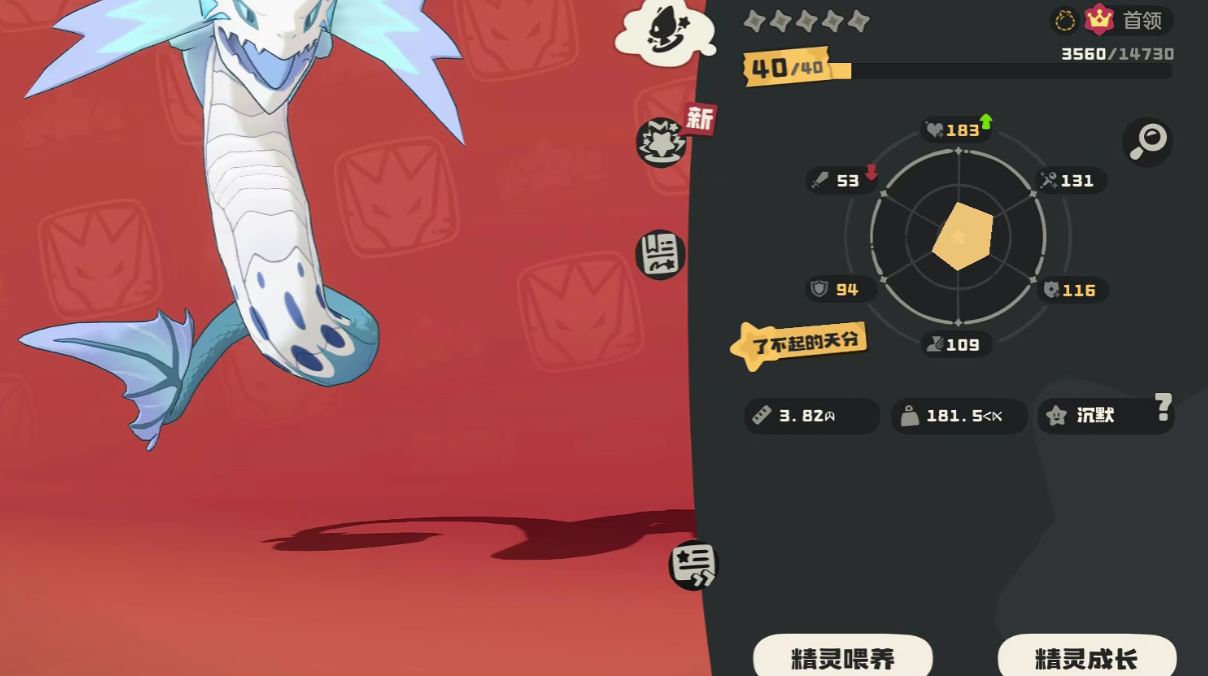 暗影冰龙王在游戏当中的定位为首领,其种族数值总和为八百点,作为冰霜属性和幽暗属性,双属性结合的小精灵,他的精力数值为144点,攻击数值为135点,防御数值为125点,魔法攻击数值为118点,魔法抗性为138点,速度数值极高高达140点,在游戏当中,可以凭借最快的速度,抢占先机。