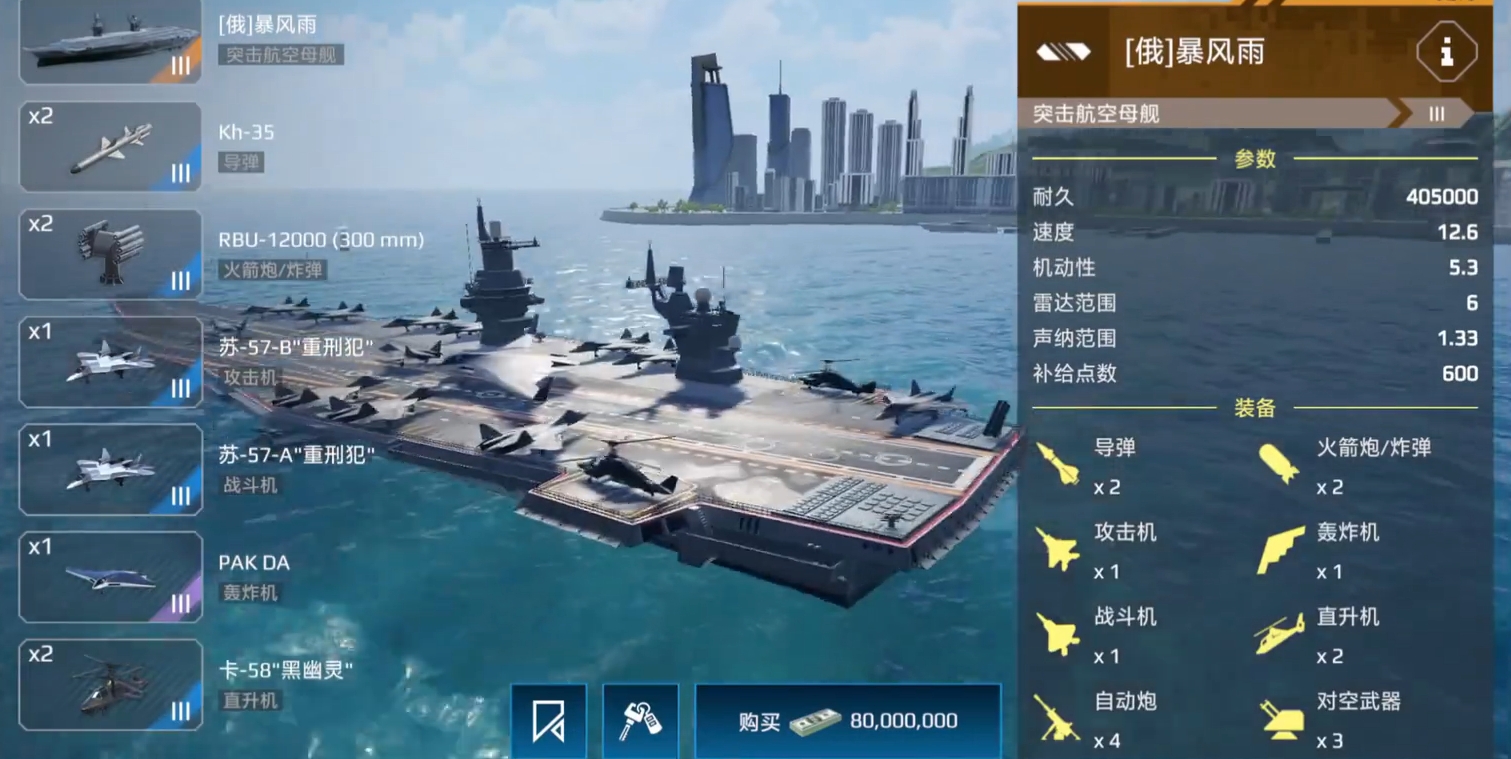 作为突击型航母,暴风雨在游戏里的售价高达八千万游戏货币(仅航母),价格还是比较贵的,但它能搭载战斗机、攻击机、轰炸机、导弹,自身还拥有防空炮、火箭炮等,整体的参数也比较不错,所以在性能上可谓相当的优秀,同时也是一艘在各方面都比较全面的航母。