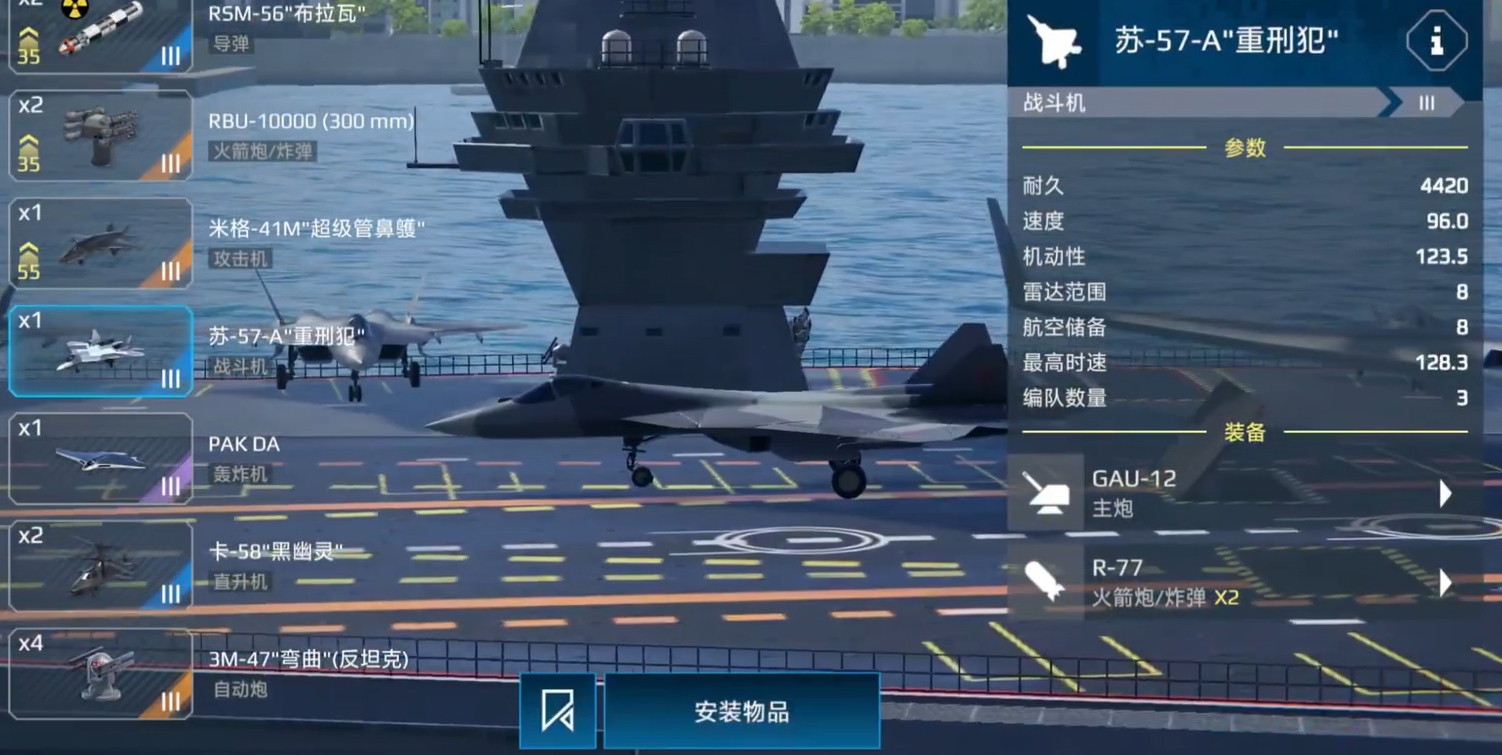 在武器的配置上,玩家们如果想把它当作参与战斗的主力舰,那么就把自己所拥有的高性能飞机都装配到它这里就好。而在导弹的选择上,除了可以选择射程远的导弹来与飞机进行协同外,也可寻装填较快的来防一手紧急情况。火箭弹则更建议装配上能反潜的,避免自己被潜艇接近时缺少还手的手段。