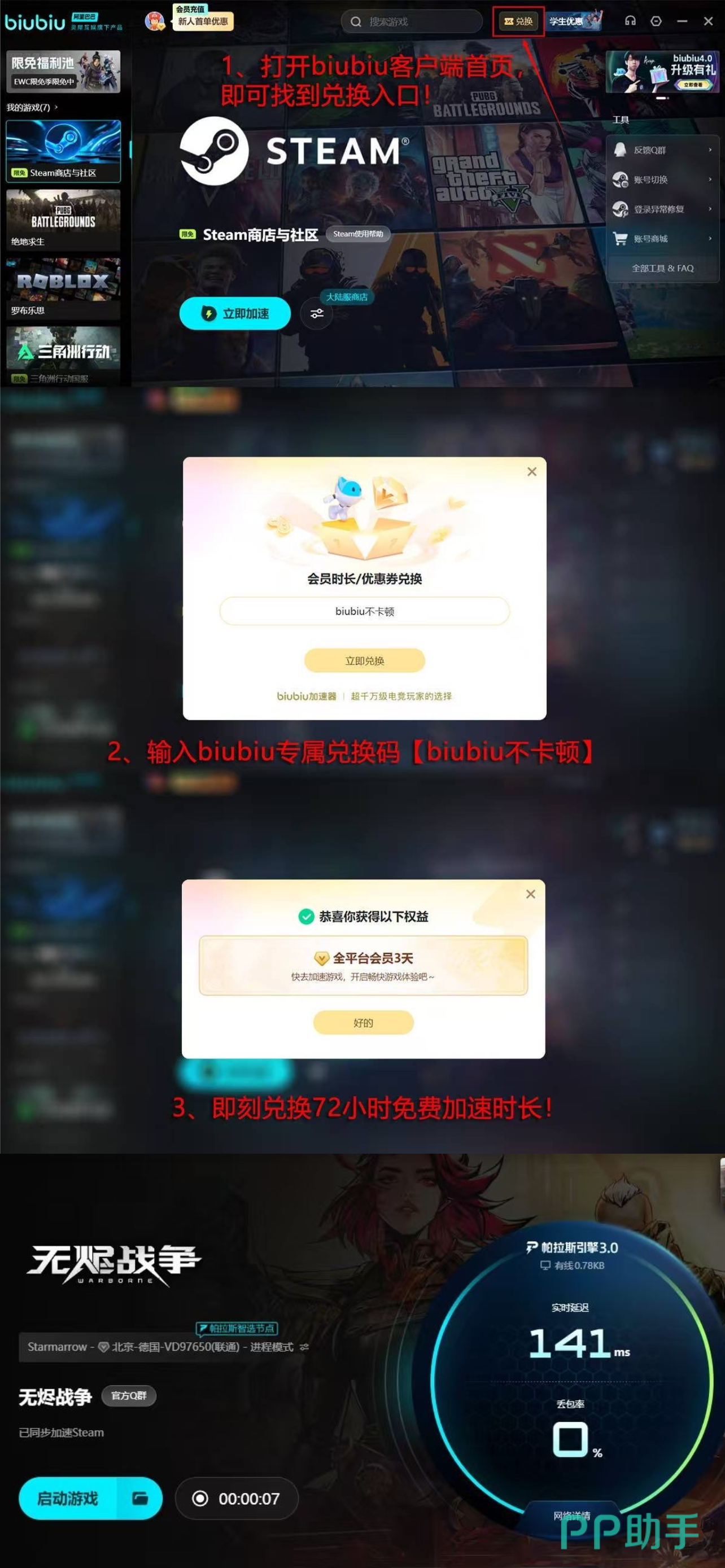 其中,biubiu加速器表现尤为出色,支持多平台加速服务,特别针对Steam等国际平台进行了深度优化。新用户注册后即可获得由系统自动发放的24小时免费试用时长,同时所有用户还可通过输入指定口令【biubiu不卡顿】领取额外三天体验权限,可在活动页面兑换使用,零成本感受流畅下载体验。