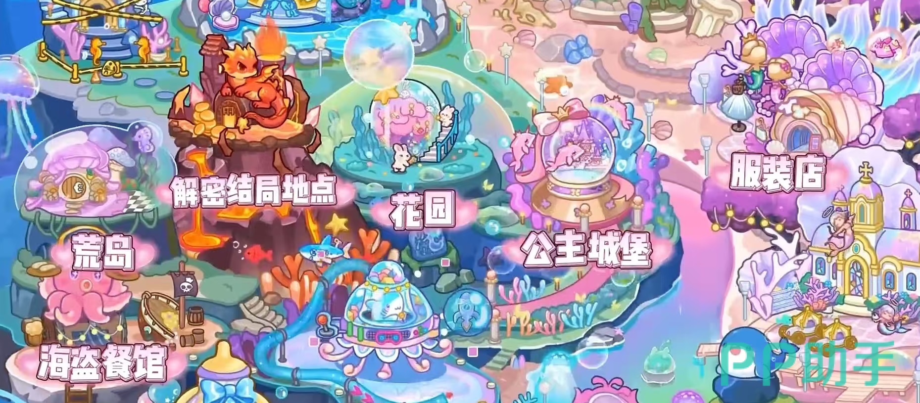 作为游戏首发地图,人鱼海湾以深海童话为叙事基底,融合多维场景结构与强交互玩法。全图共设九大核心功能区域,各具主题特色与玩法逻辑,构成完整的内容生态闭环。首处为“海底冒险”区域,采用三层垂直空间设计:表层为可垂钓的小岛;中层过渡至水下通道;底层则展开为动态海洋乐园,玩家可与拟人化美人鱼及海洋生物NPC互动,体验轻度叙事与社交玩法。