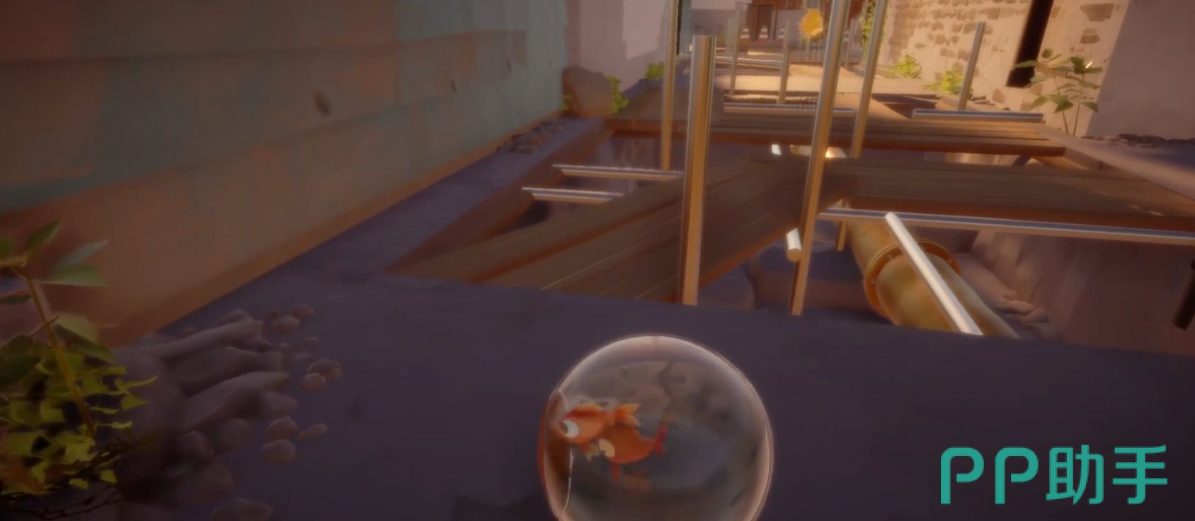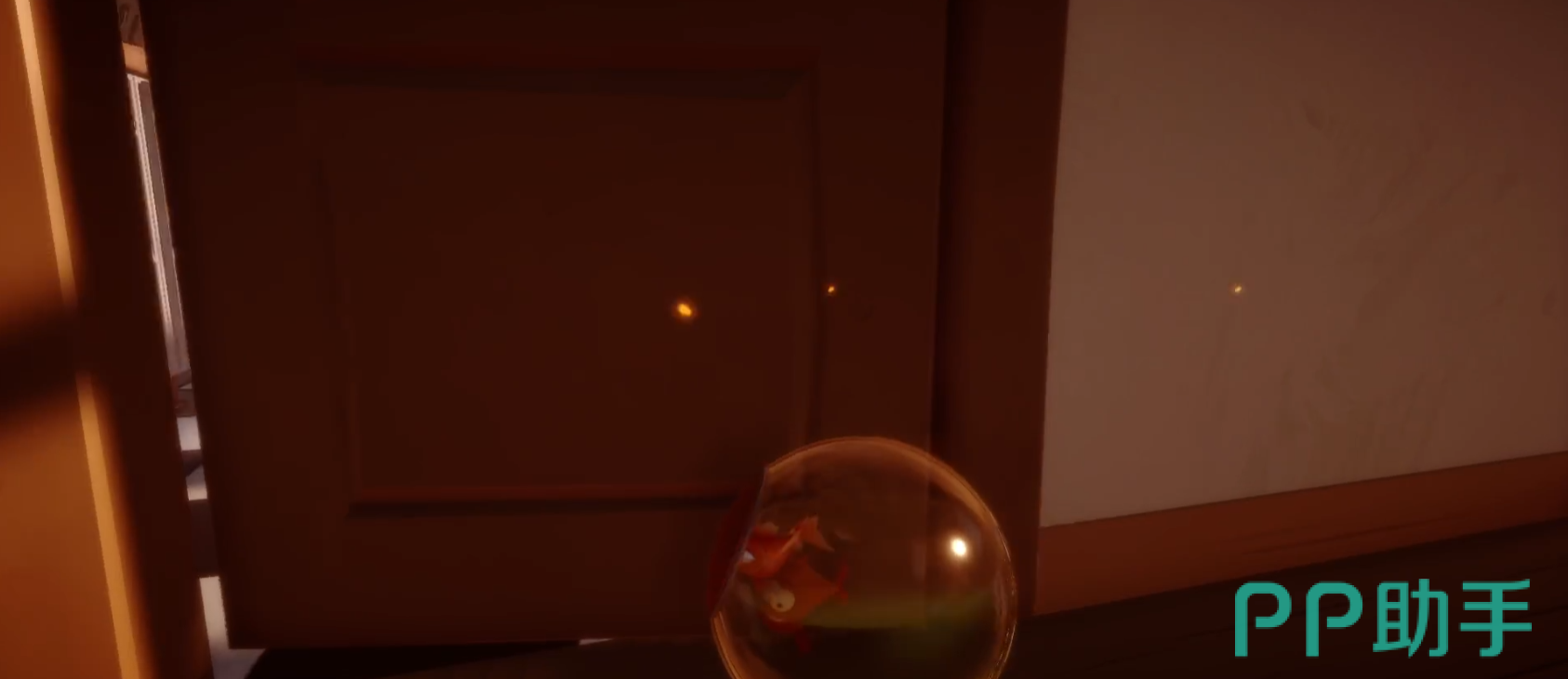 在进入屋里的时候,我们会触发一段剧情,等待剧情过完,我们会进入一个鱼缸,而这时候我们也就可以自由移动了。进入鱼缸之后我们顺着楼梯往一楼下,在二楼的最前方我们会发现一片面包,小伙伴们注意一定要拿了面包再下二楼!下到一楼之后,我们会发现一个虚掩着的门,里头会传来钢琴声,我们进去即可。