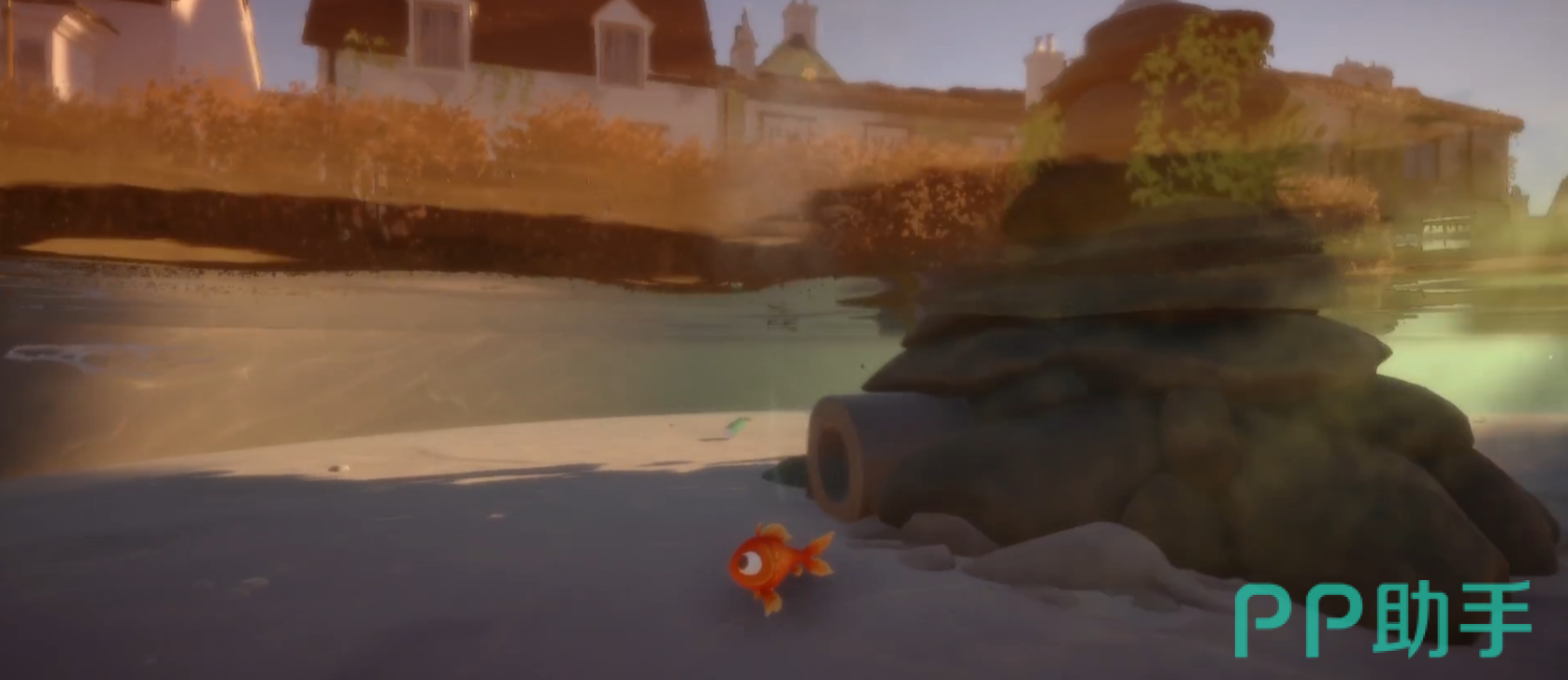在游戏的一开始,我们会作为一条金鱼,进入到一片水塘里面,在这个池塘里面会有一个面包片,我们需要往相反的方向过去先拿到面包片,才能继续前进。拿到面包片之后,我们朝着别墅的方向游动,然后会发现一个石碓,凑齐看会看见石碓的左下方有一个洞口,我们从这个洞口进入,之后水压便会将我们给弹射到房子上方的水管里面,我们向右边游泳前进。