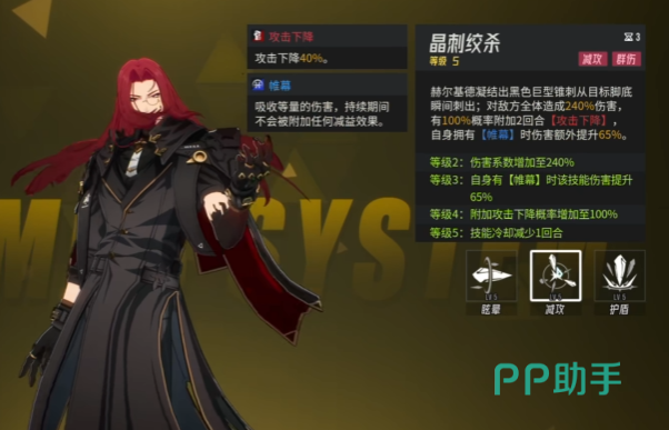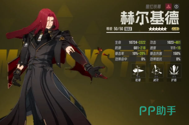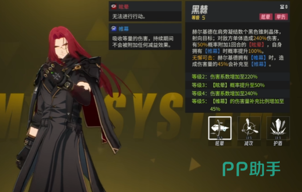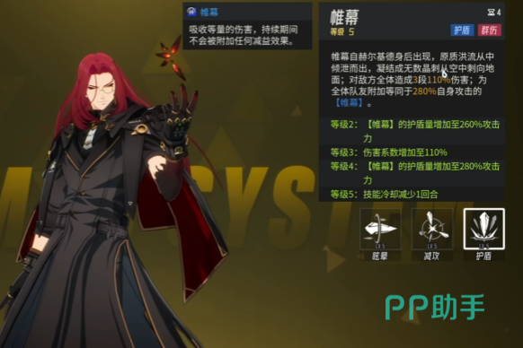 赫尔基德的普通攻击会在肩部凝聚黑色锥形晶体,短暂蓄力后沿直线发射,命中目标造成伤害并附加行动禁制效果,使其无法行动。其范围技能“禁蚀绞杀”可从敌方脚下召唤巨型尖刺群,对全体敌人施加伤害,并有一定几率使目标攻击力下降,持续2回合,有效压制对手输出能力。终结技“帷幕”为全屏多段打击技能,不仅能对所有敌人造成高额伤害,还能为我方全体成员附加基于本次技能总伤害一定比例的护盾效果,显著提升团队生存力。
