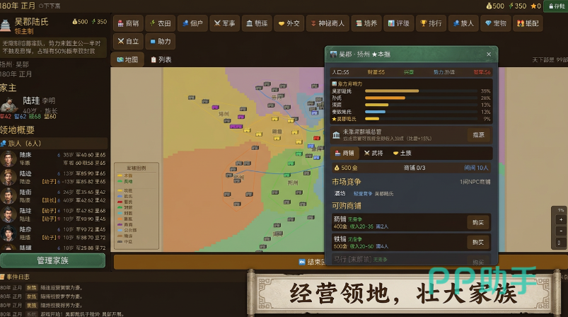 游戏开局阶段,玩家需从多个历史世家阵营中择一加入,并担任该家族族长。各世家在初始资源、地理区位、成长倾向等方面存在差异化设定,例如部分家族侧重中原粮仓开发,部分则占据边关要道利于商贸或军事扩张。玩家可根据自身策略偏好选择,后续发展路径高度自由——可深耕农耕提升屯田效率,可拓展商路积累财富,亦可强化军备参与势力博弈,实现家族由弱至强的完整演进。