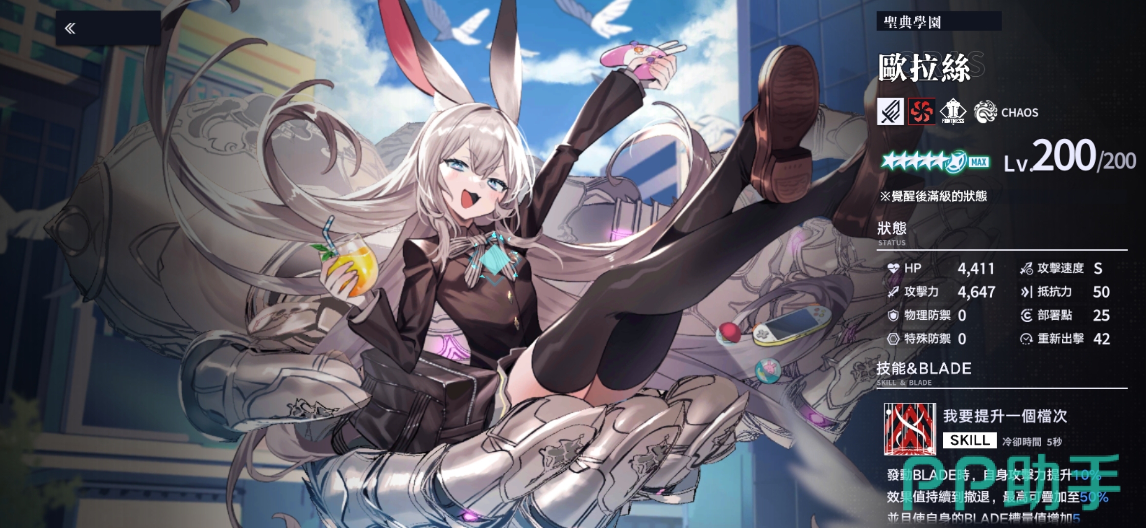 欧拉丝出自常驻卡池,是新手阶段极具性价比的核心输出人选。她的SKILL机制十分友好,每次释放BLADE技能后可叠加10%攻击力,最高可达5层(即50%增益),同时加快BLADE能量槽的积累速度,实现高频连发输出。其BLADE技能本身具备700%攻击力倍率的强力单体物理打击,并附带击退效果,非常适合应对Boss战或高血量精英单位。建议新人玩家优先考虑抽取欧拉丝,迅速建立起稳定的主力输出线,轻松推进前期关卡和资源本挑战。