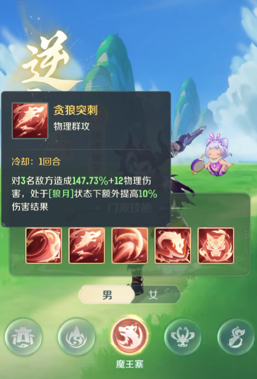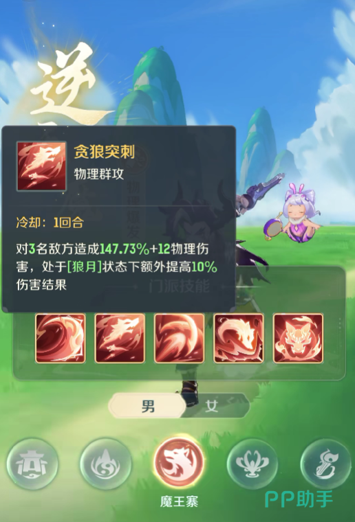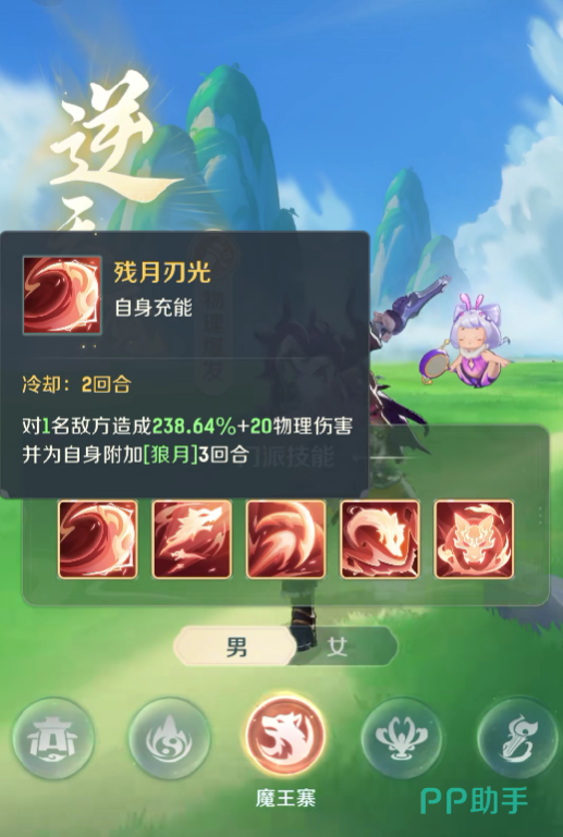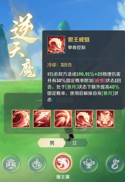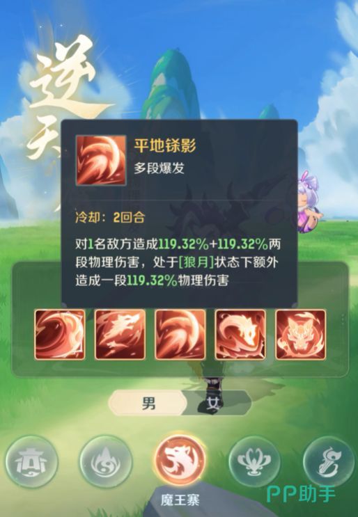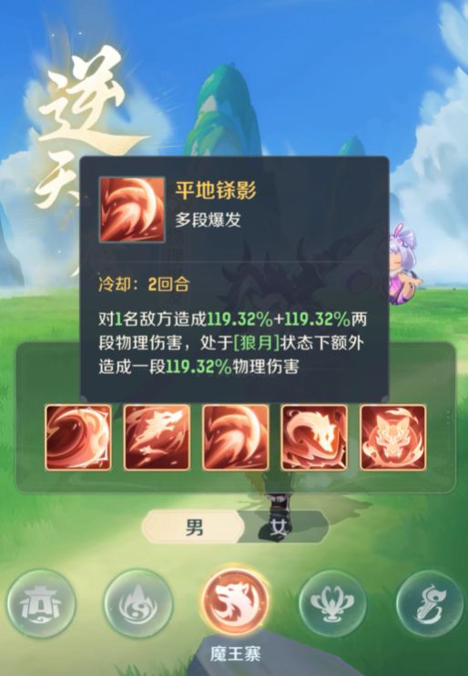 要说魔王在的基础技能,也就是他的一技能残月刃光,可以有效的对单体目标造成附加状态的伤害,可能这个技能看上去比较简单,但是在战斗的时候却可以发挥出不错的效果,可以给敌人增加附加的状态,也能够为后续的技能释放创造条件。