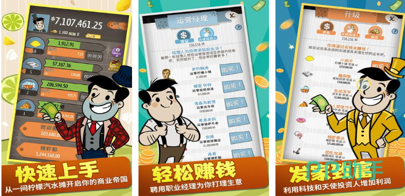 大富豪冒险家这款模拟经商的竖屏游戏上手速度超快,赚钱过程也很轻松能让大家感受发家致富的乐趣,虚拟经营玩法跟模拟富豪的感觉交相呼应,游戏内存在数之不尽的赚钱项目等待大家解锁,萌系风格的背景无疑让气氛显得休闲自在,化身富豪感受各种有趣投资项目的设定别具一格,真实富翁的快乐生活让人乐在其中。